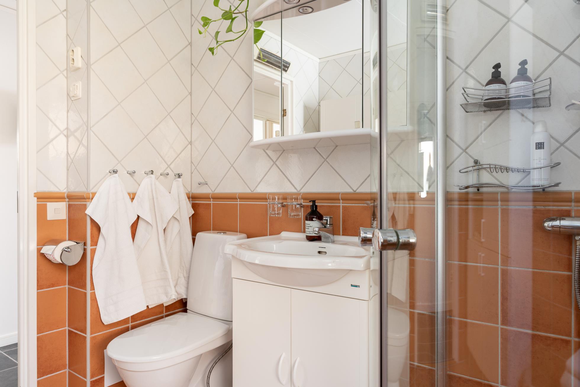 Duschrummet som finns lite längre in i hallen har klinkergolv och golvvärme. På väggarna finns kakel. Handfat med kommod, överskåp med spegelglas, duschhörna och wc.