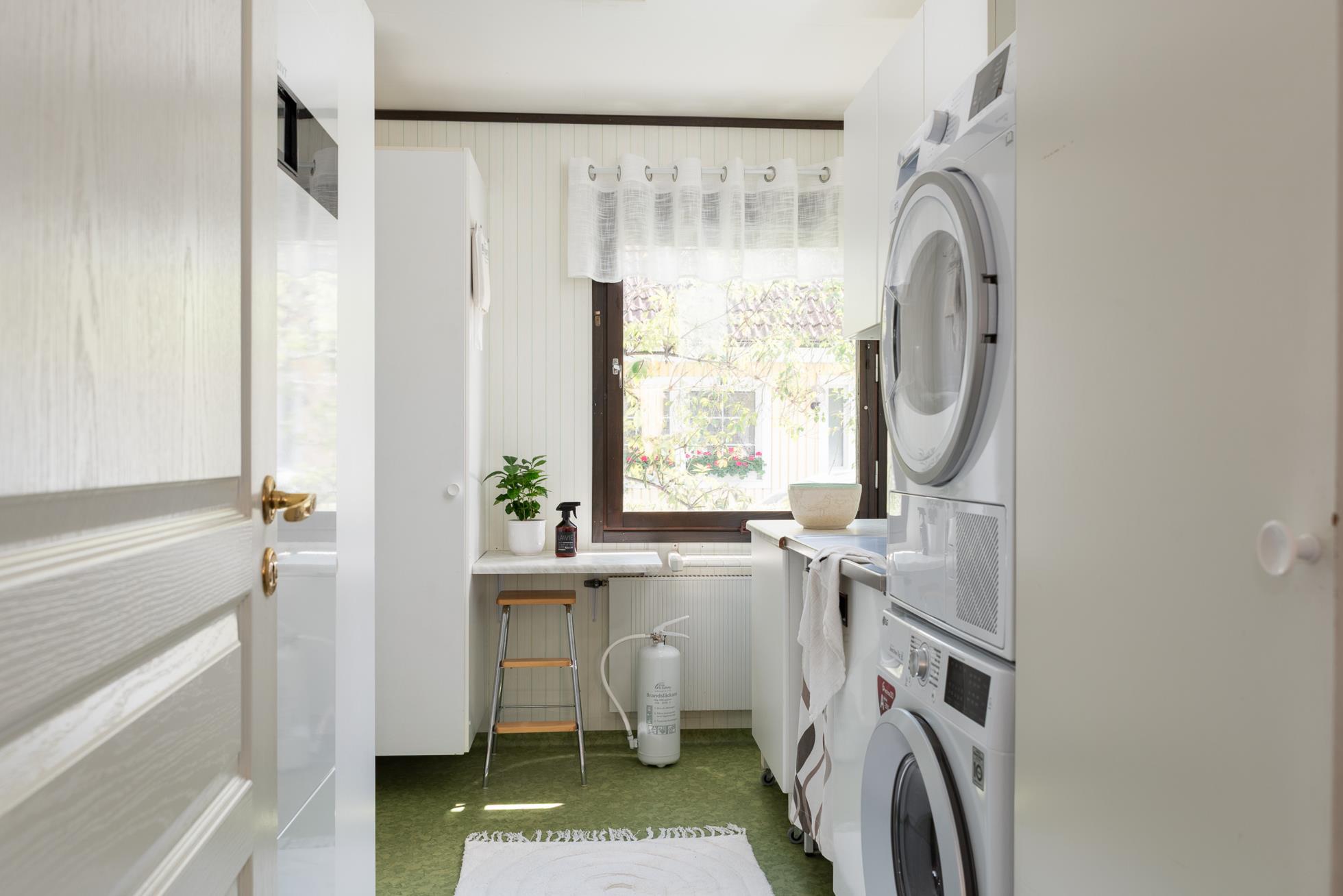 Via groventrén kommer man in till tvättstugan. Här är det enkelt att ta in barnen och ta av dem de blöta kläderna för att sedan lägga in de i tvättmaskinen. Grovéntren har laminatgolv och tapet i grå nyans och fyra garderober efter helvägg. Tvättstugan har våtrumsmatta och våtrumstapet. Tvättho, tvättmaskin och torktumlare. Här finns också värmepannan.