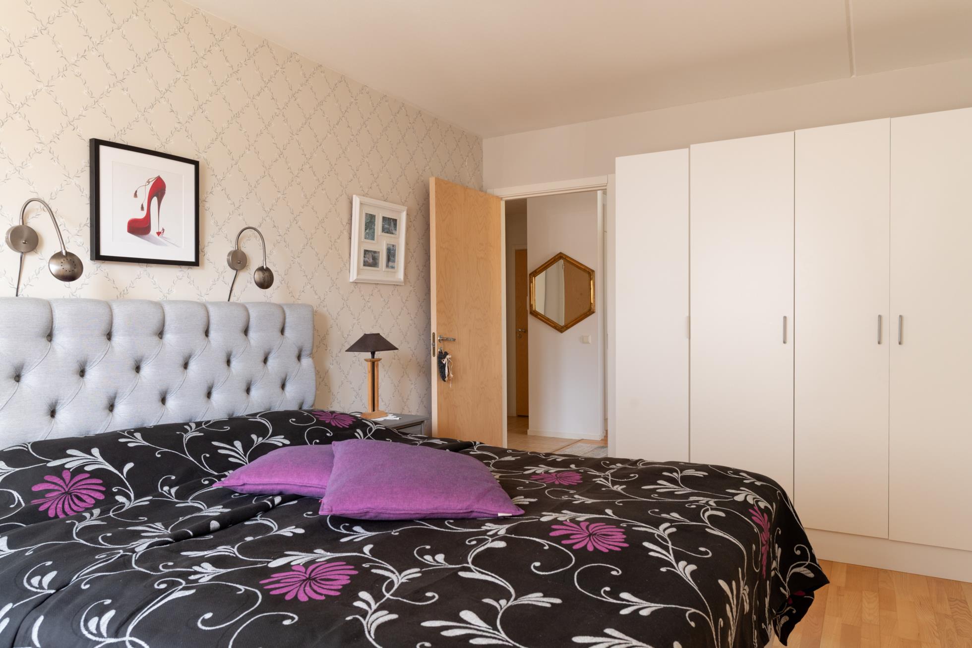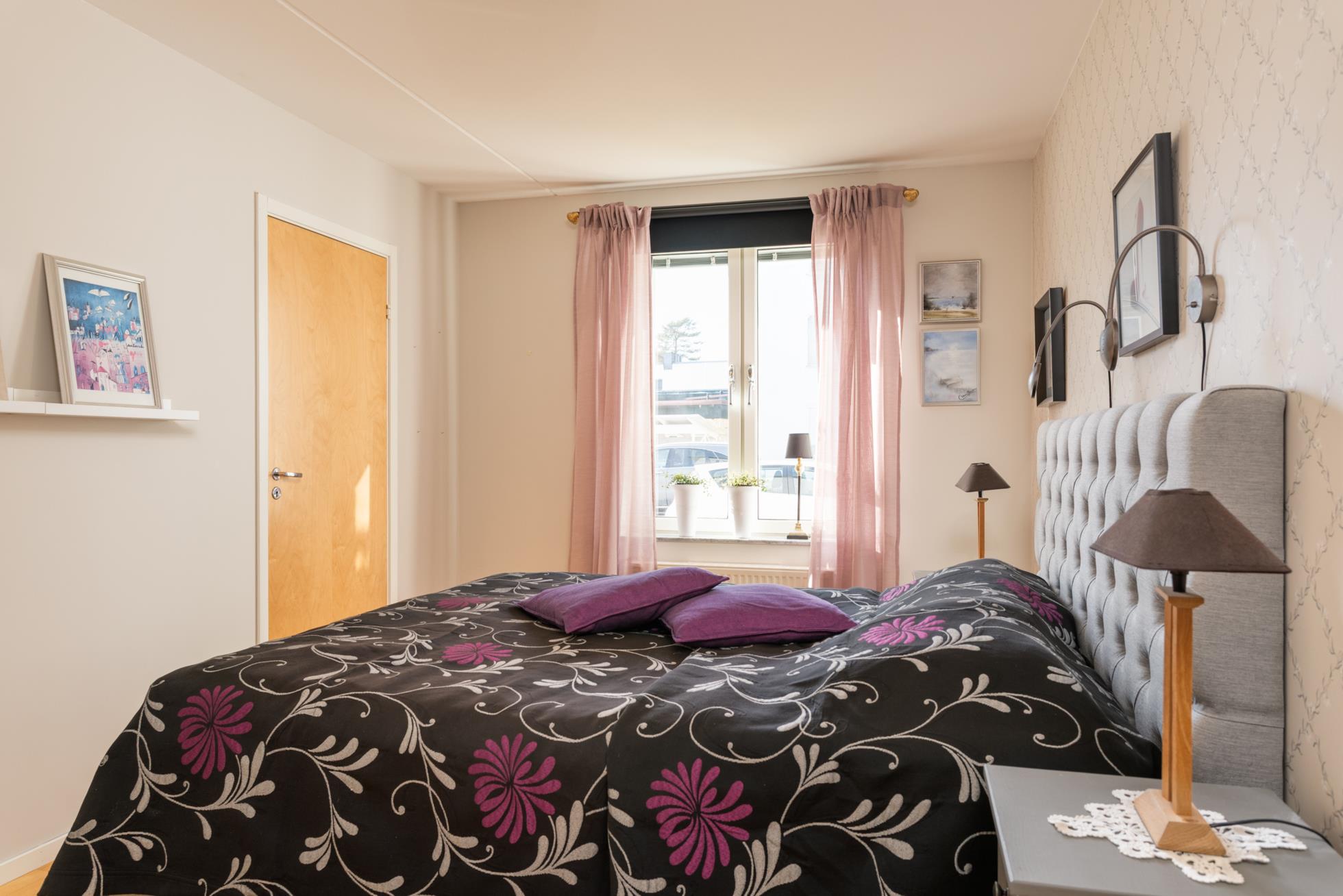Sovrummet ligger direkt till höger om hallen och efter duschrummet. Finns bra förvaring i form av en dubbelgarderob, en enkelgarderob samt ett linneskåp. Väggarna är målade i beige kulör och bakom sängen sitter en fondtapet. Rummet har också en rymlig klädkammare som är perfekt för en strukturerad vardag.