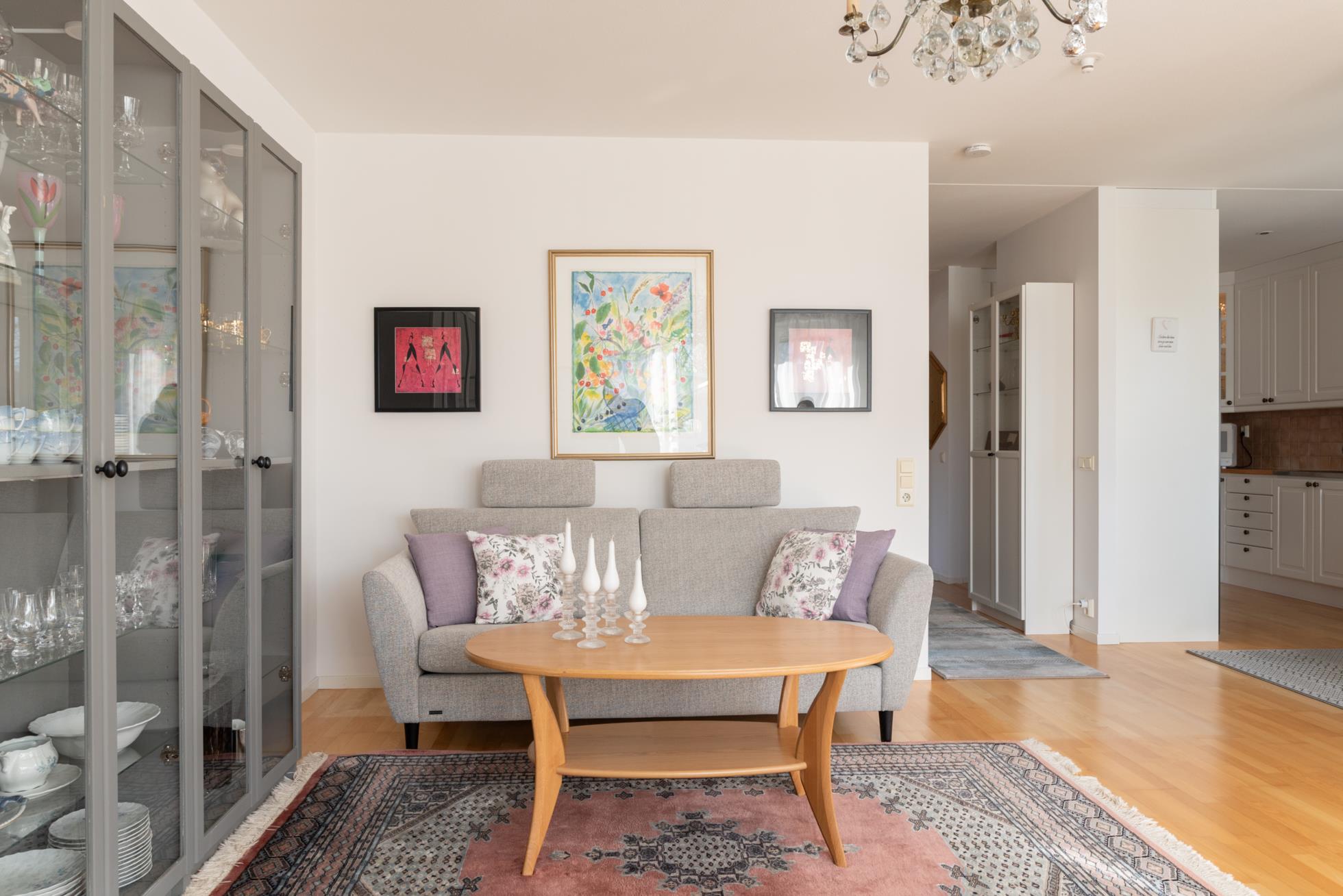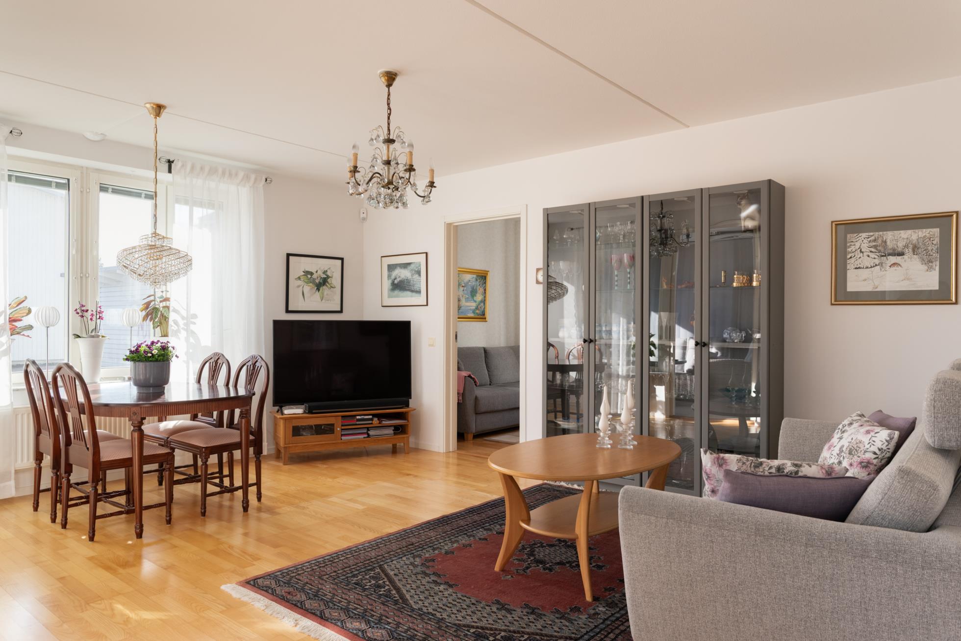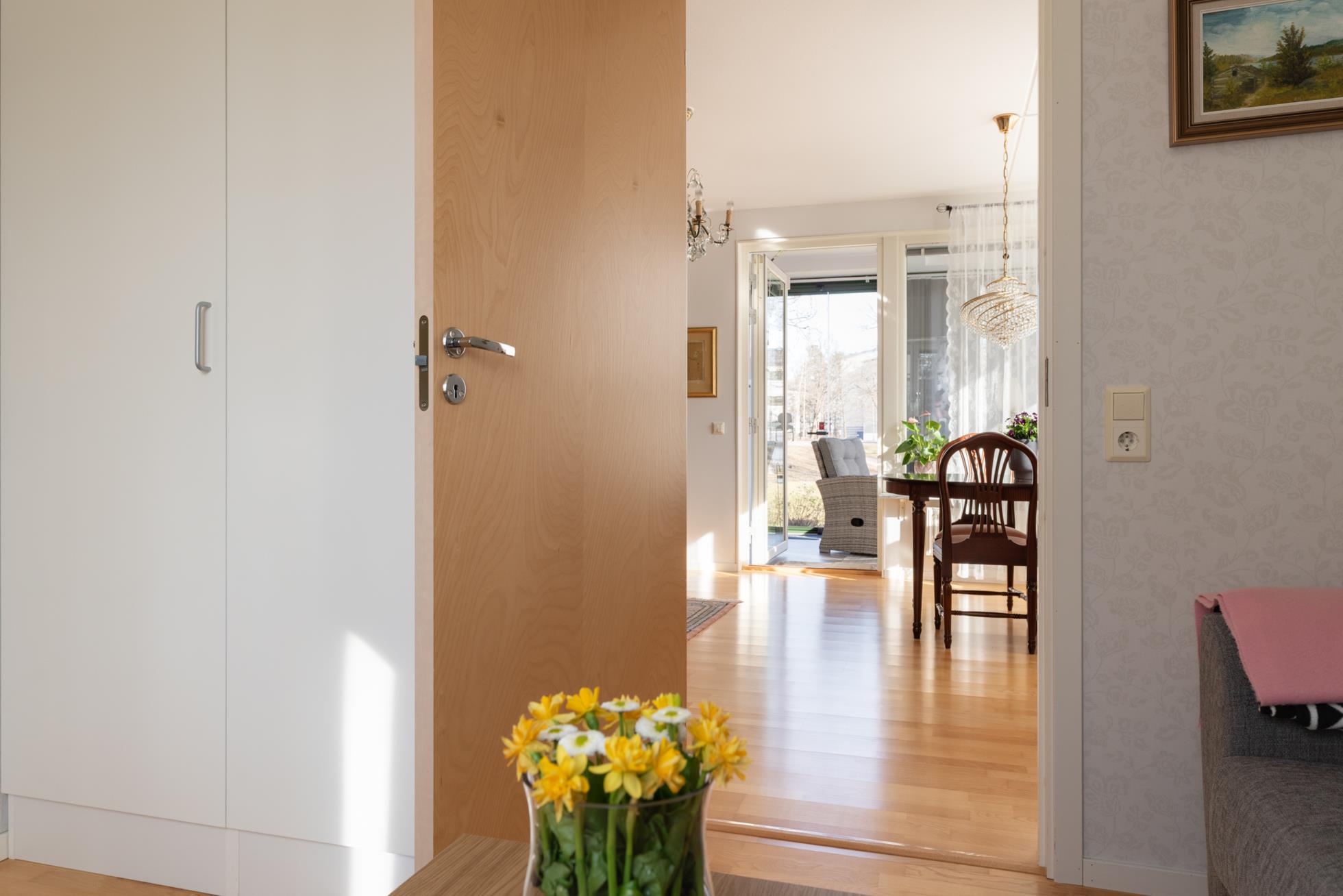 Rakt fram från hallen kommer du in i det ljusa vardagsrummet med anknytning till köket samt det fina inglasade uterummet. Väggarna är målade i ljus kulör. Rymligt vardagsrum för plats med soffgrupp och även utrymme för ett till matbord längst med fönsterna för större bjudningar.