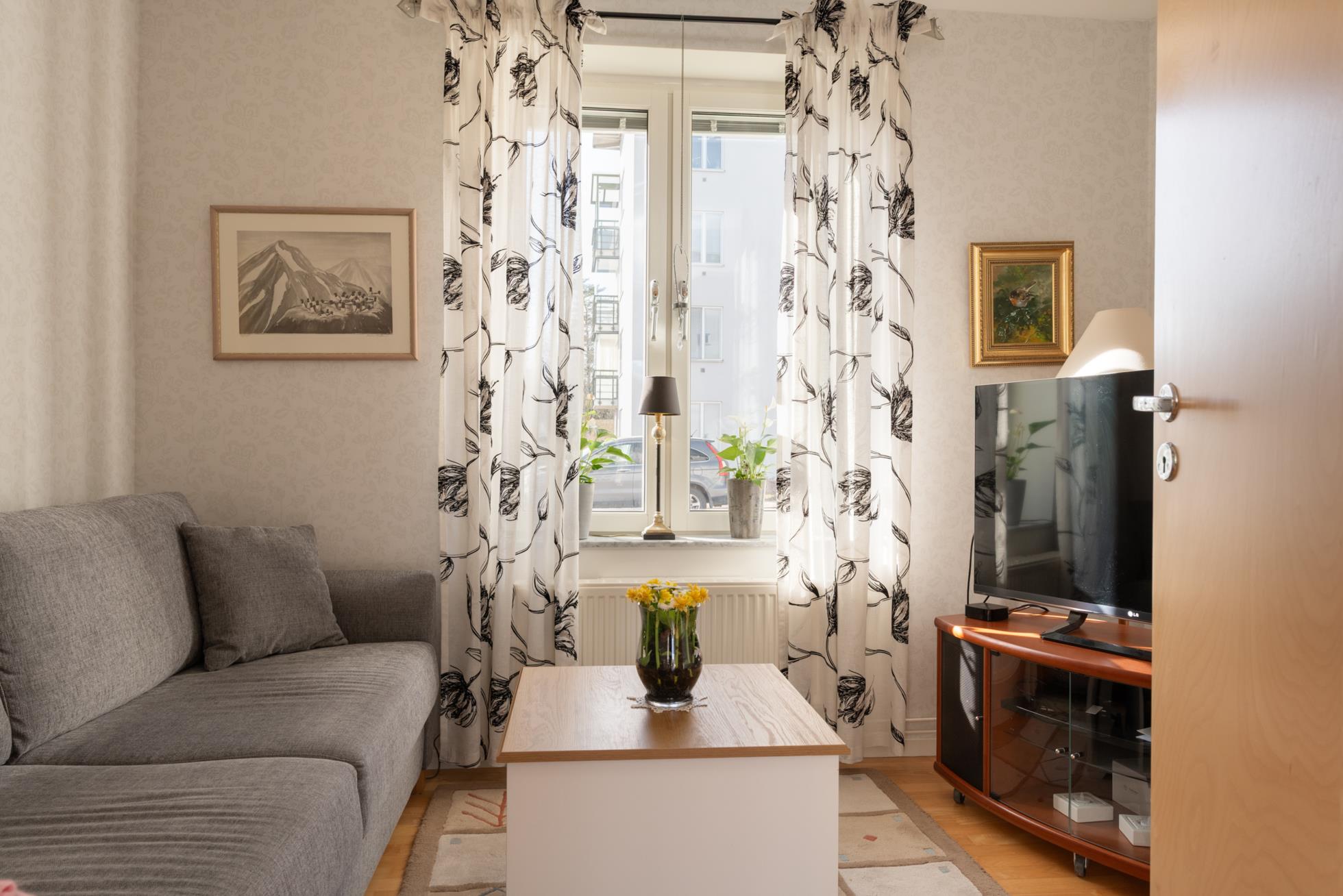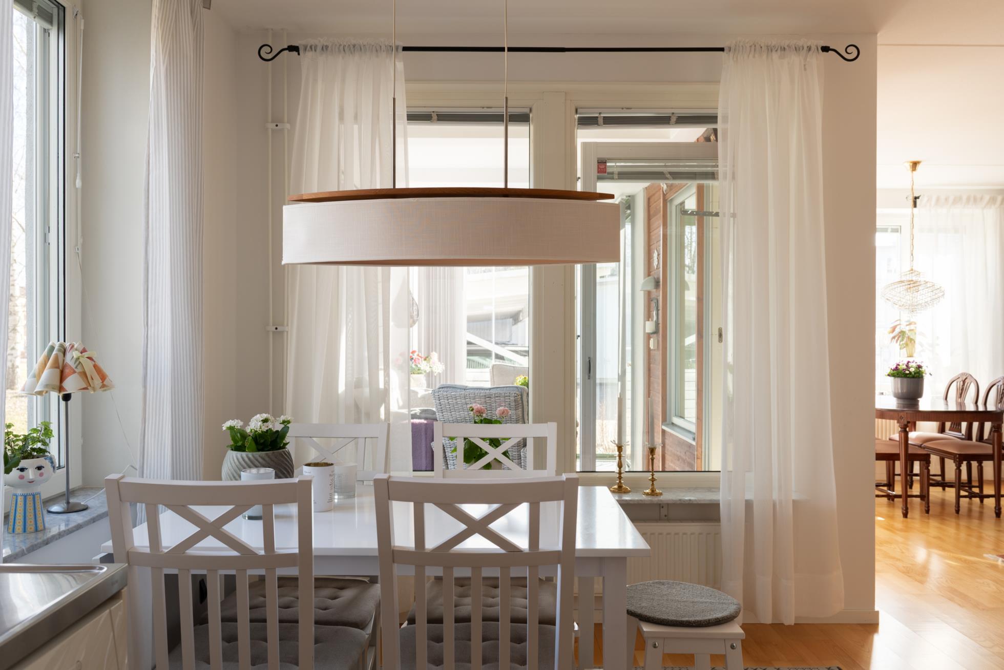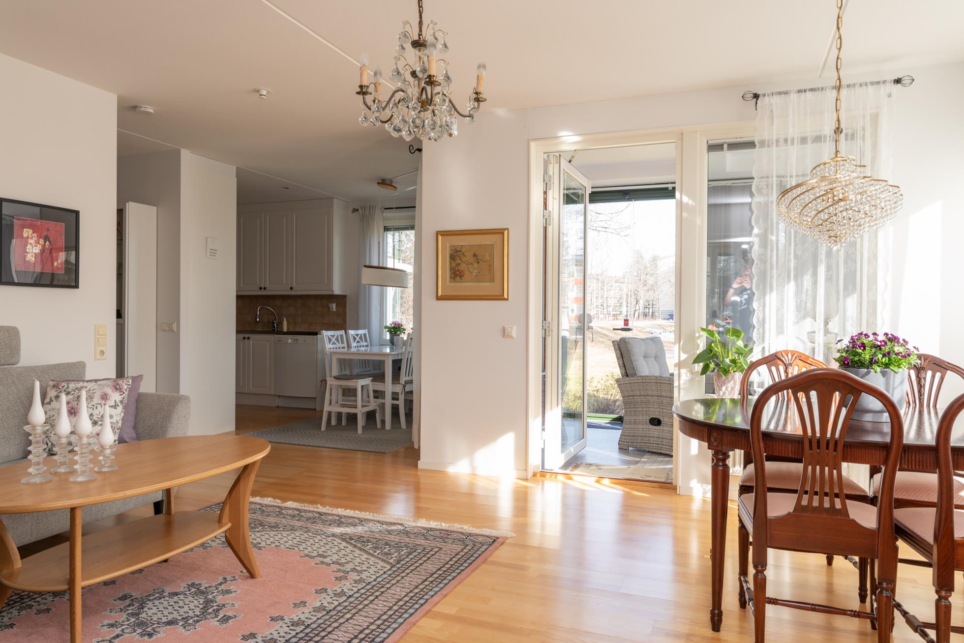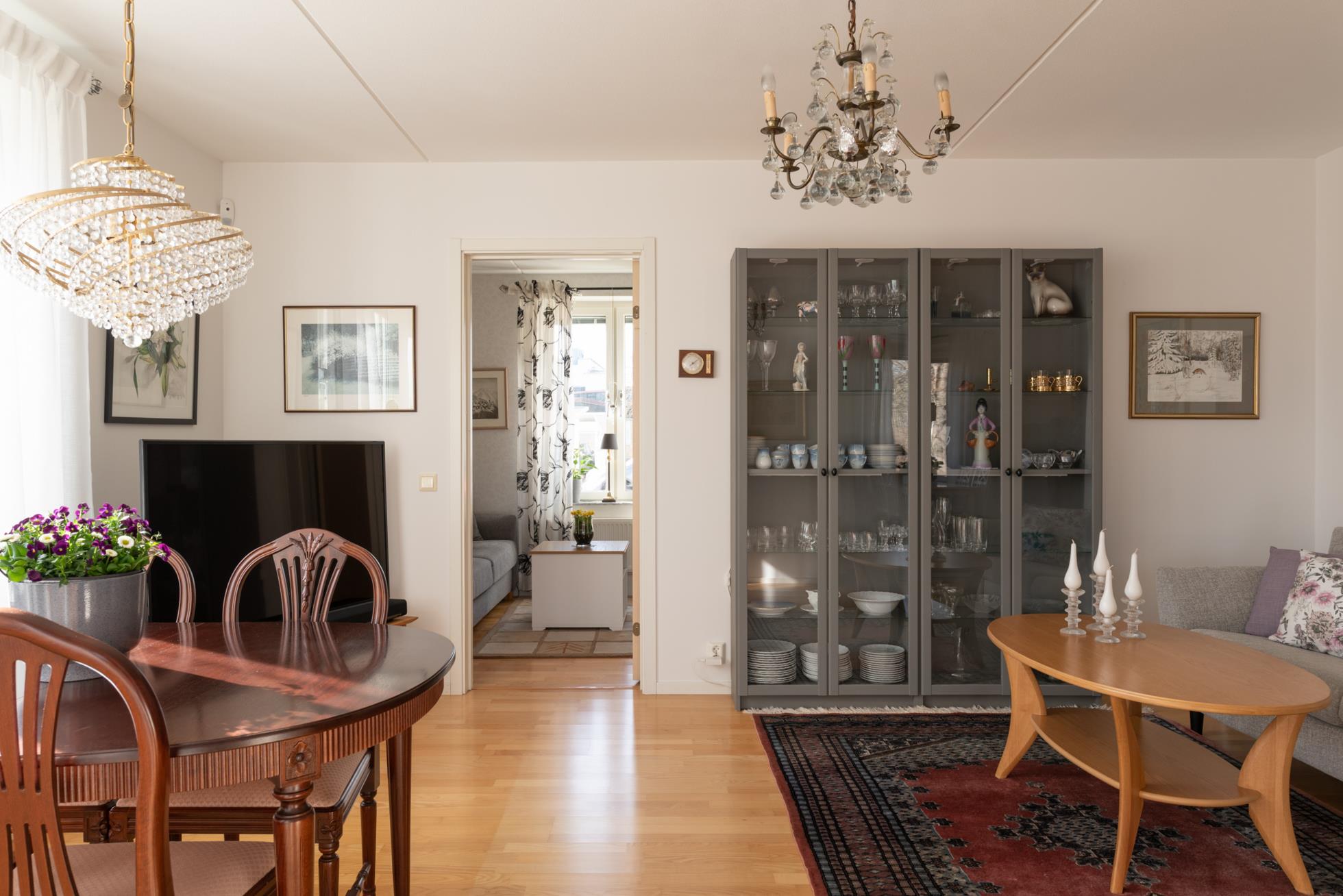 Rakt fram från hallen kommer du in i det ljusa vardagsrummet med anknytning till köket samt det fina inglasade uterummet. Väggarna är målade i ljus kulör. Rymligt vardagsrum för plats med soffgrupp och även utrymme för ett till matbord längst med fönsterna för större bjudningar.