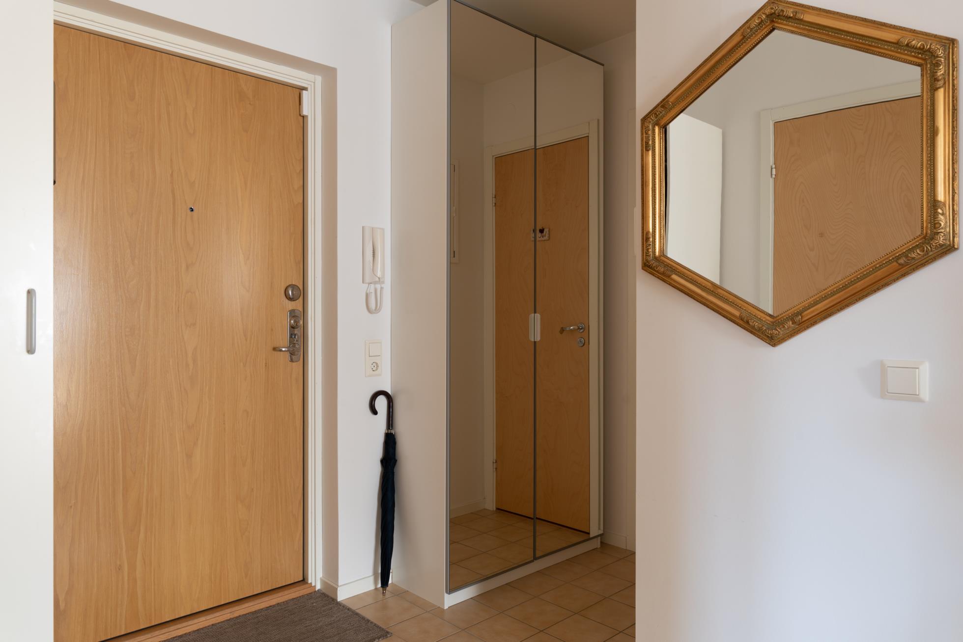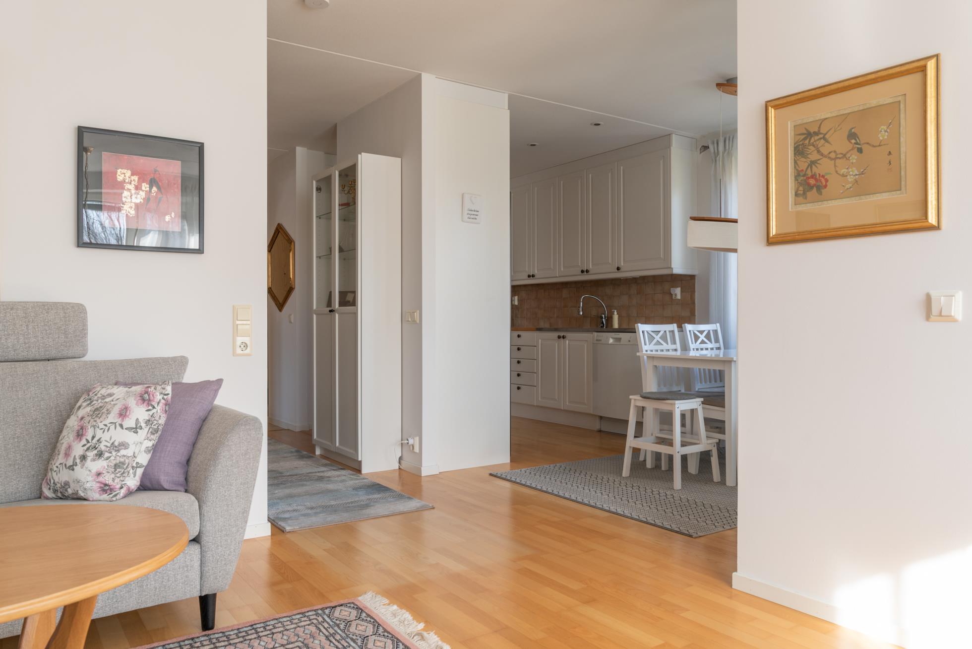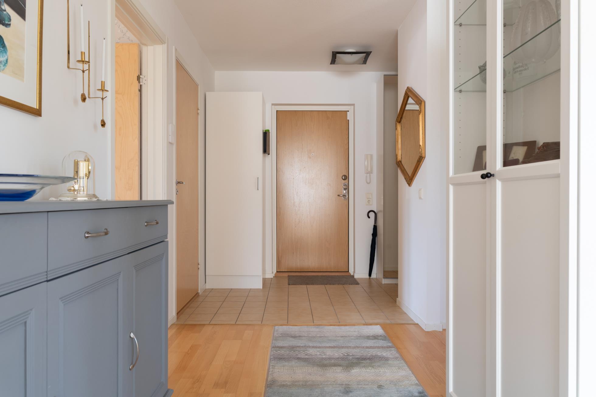 Den ljus hall visar sig från sin bästa sidan när ljuset flödar från vardagsrummet rakt fram. Väggarna är målade med ljus kulör och golvet har ljus askparkett som flyter igenom hela lägenheten. Förvaring av ytterkläder finns på vardera sida o dörren.