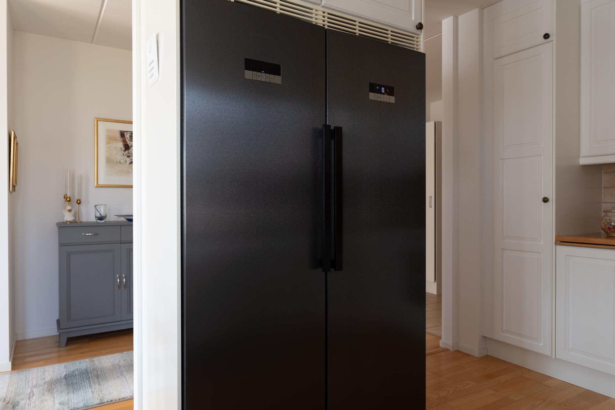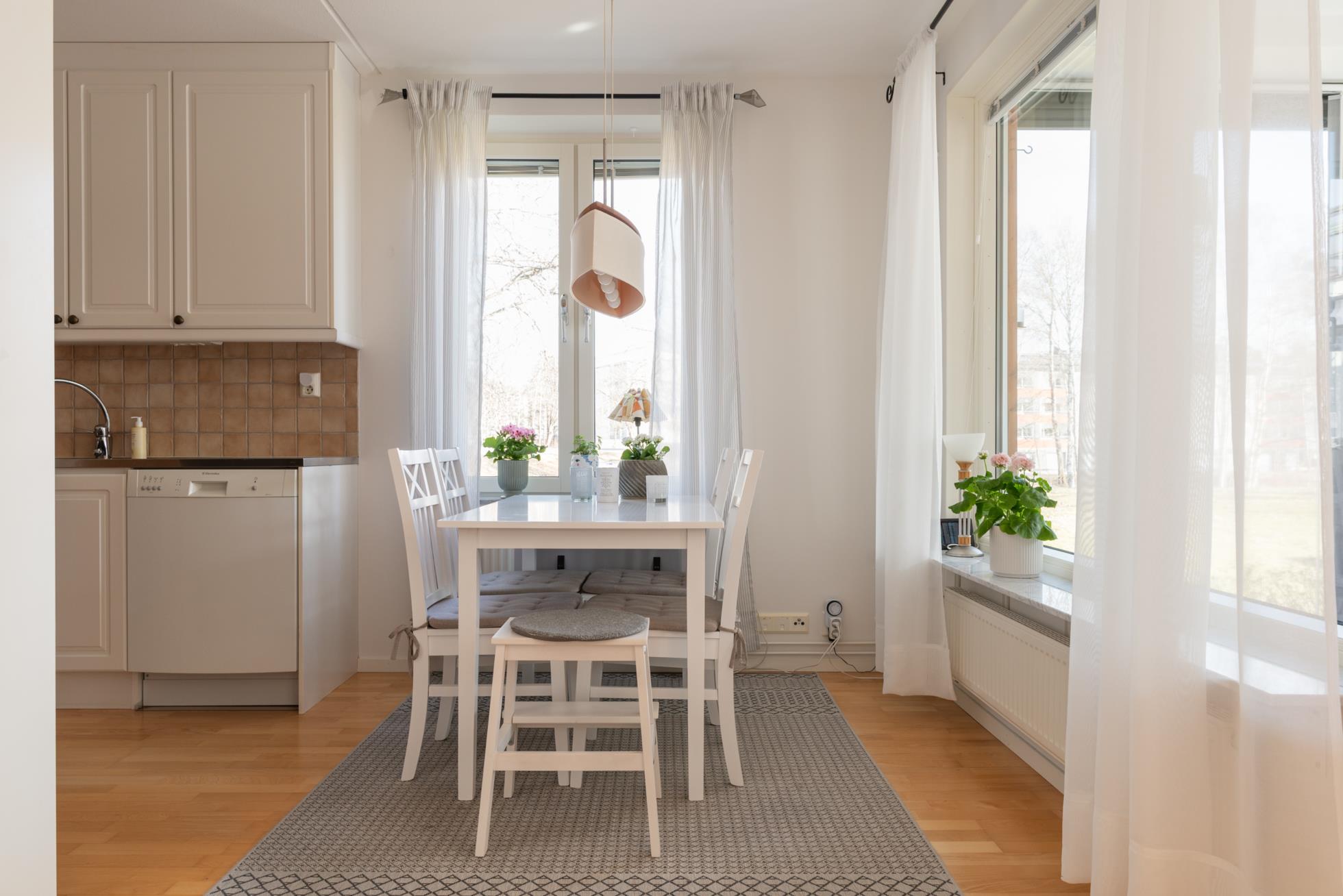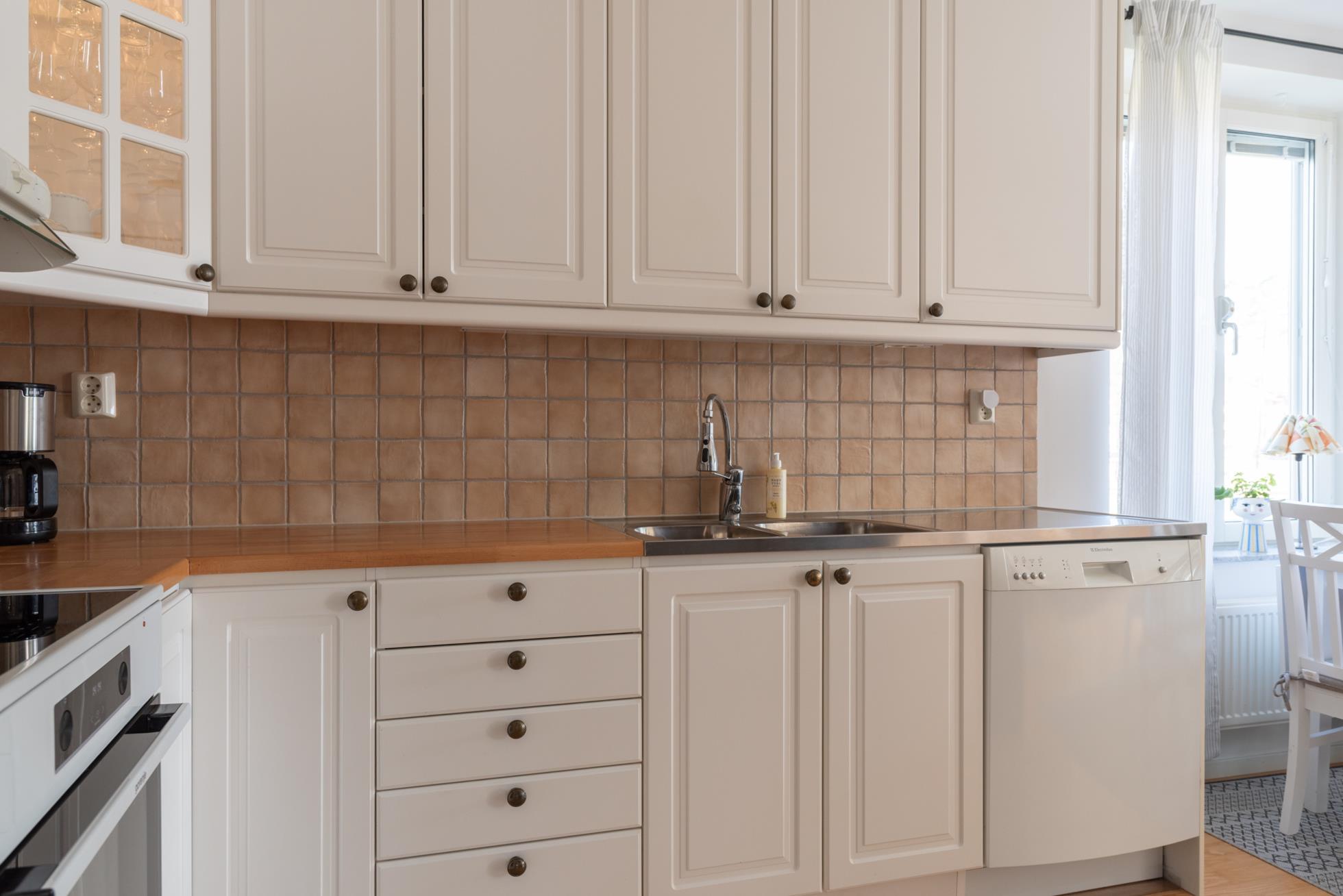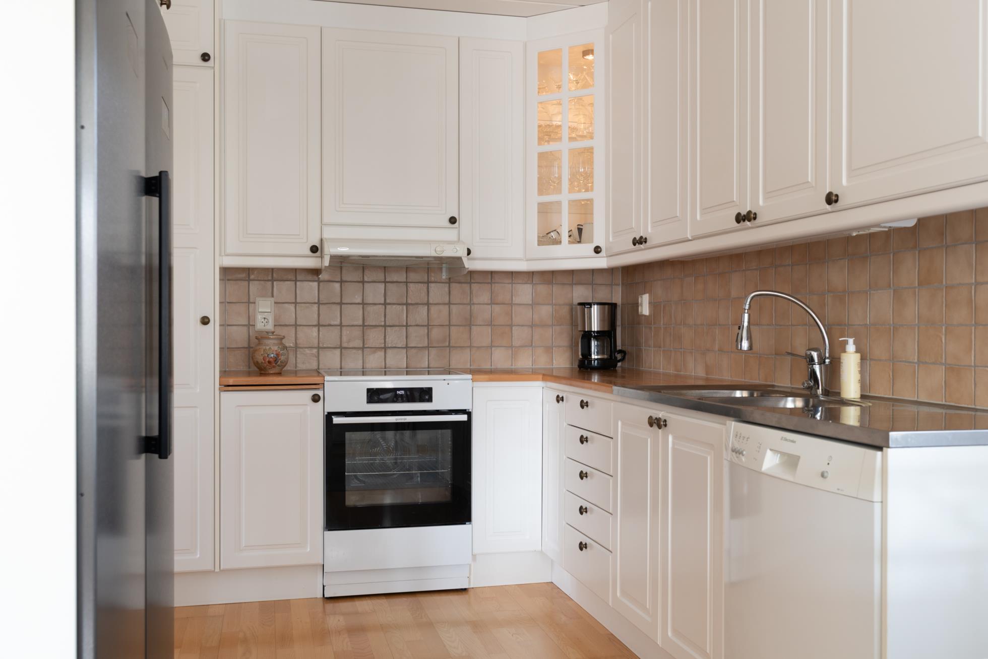 Vita köksluckor med ett stilrent upplyst vitrinskåp som är centralt placerat. Spis med induktion och ugn, spisfläkt, kyl och frys utbytta 2024 samt diskmaskin i fint skick. Öppen och trevlig planlösning mot matplats och vardagsrum med ett fantastikst ljus från alla de stora fönster i två väderstreck. Ljusa väggar och taket har Spotlights.