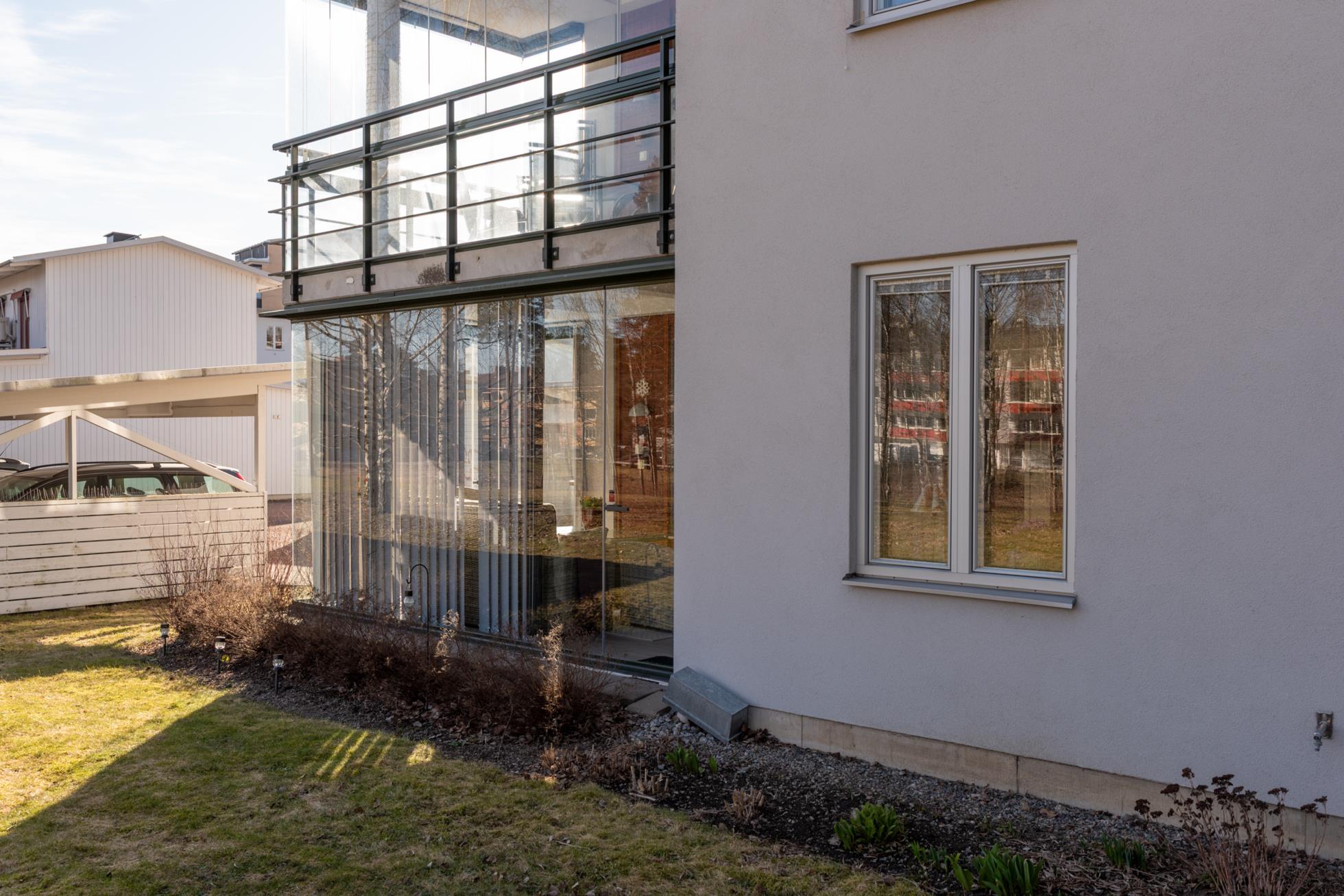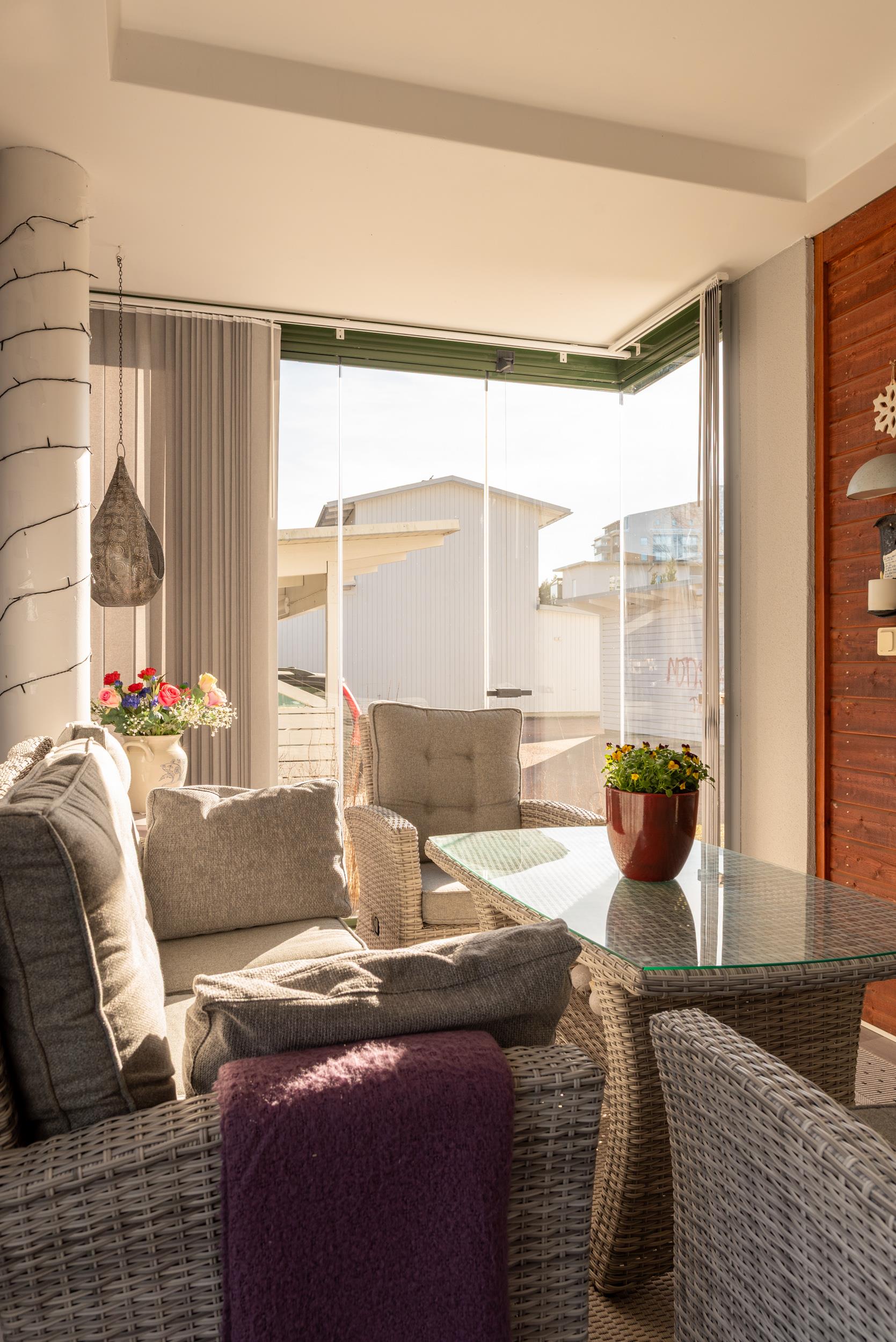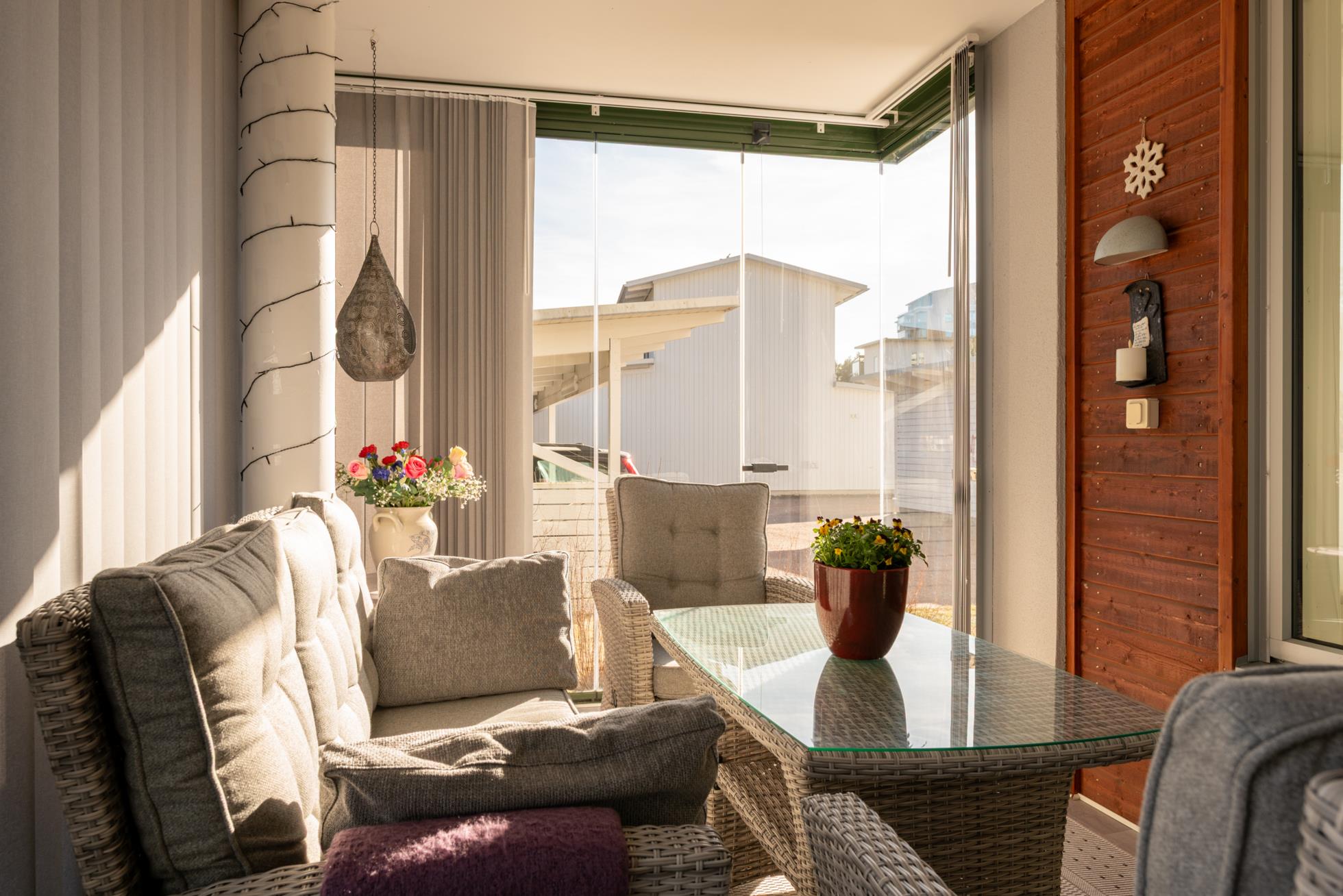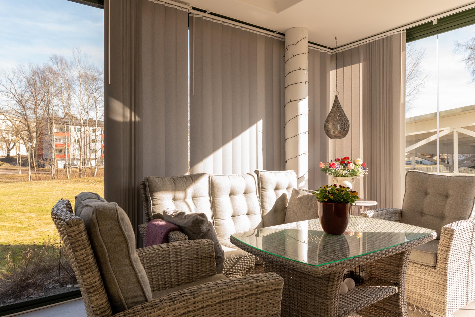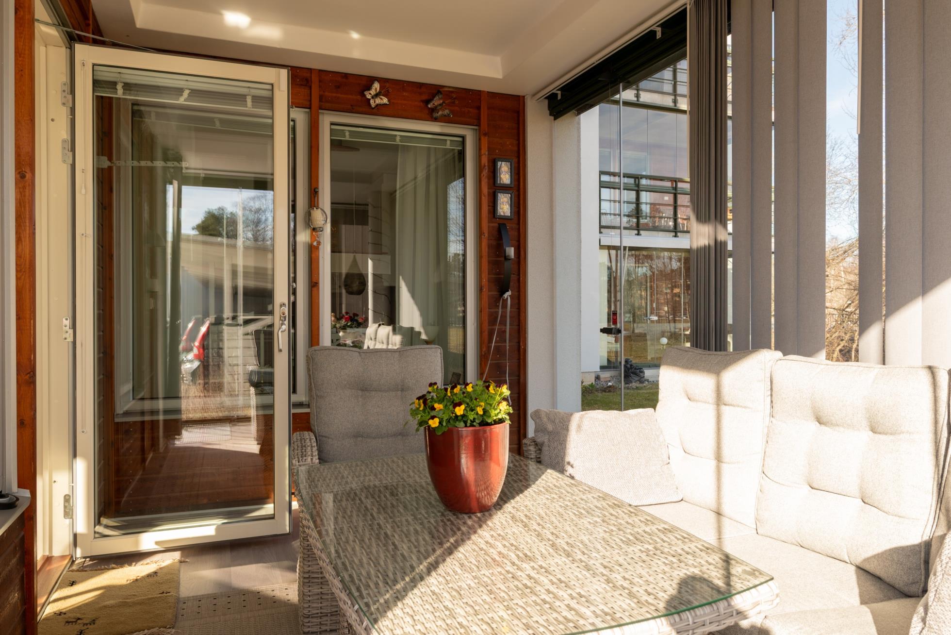 Ett charmigt uterum som förlänger hemmet och skapar en perfekt plats för avkoppling. Renoverat 2023 med nylagt trägolv, lamellgardiner, vitmålade väggar och tak för ett ljusare intryck.
