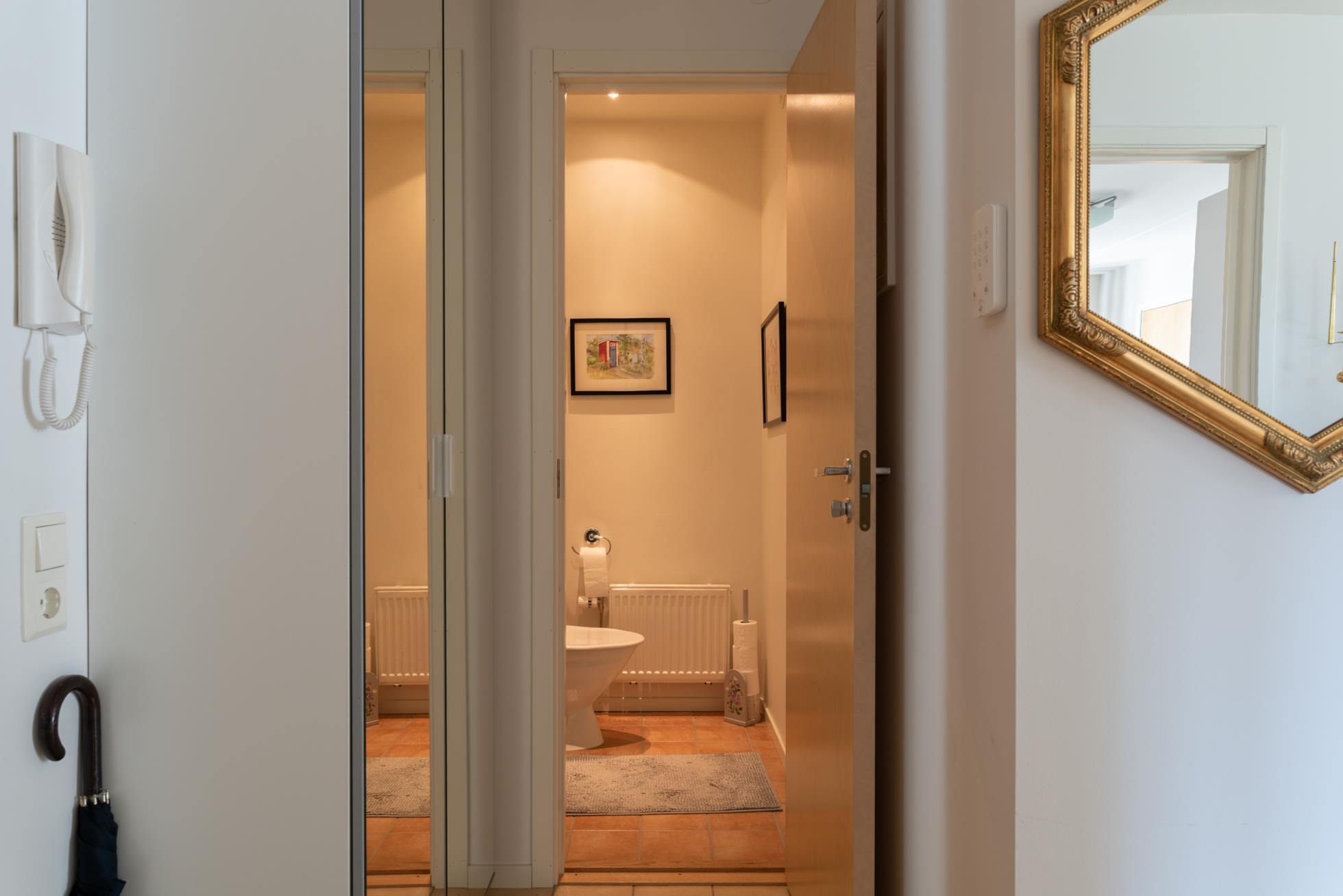 I anknytning till hallen finner du en gäst WC med handfat, spegel. Väggarna är målade i ljus kulör och golvet har klinker.