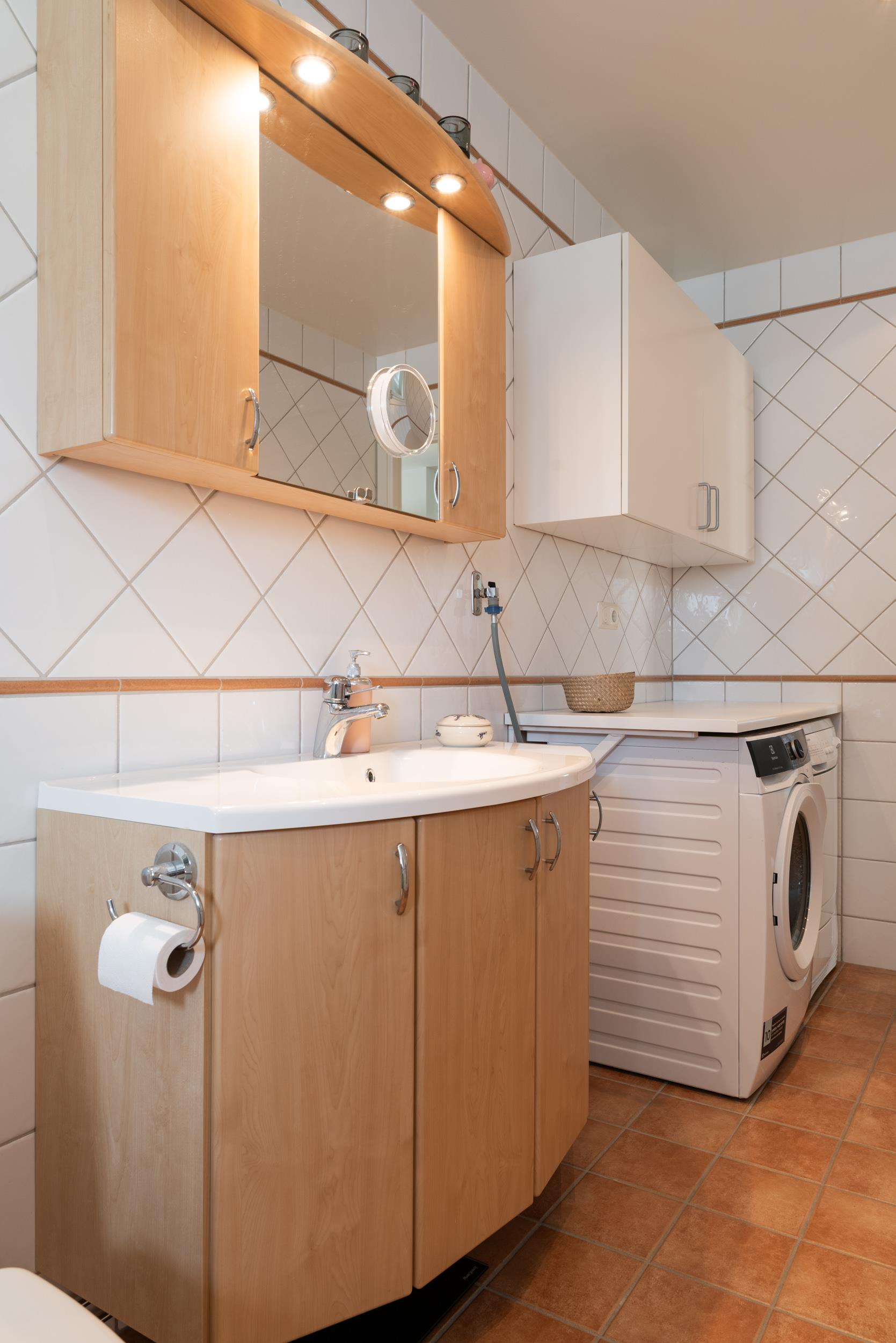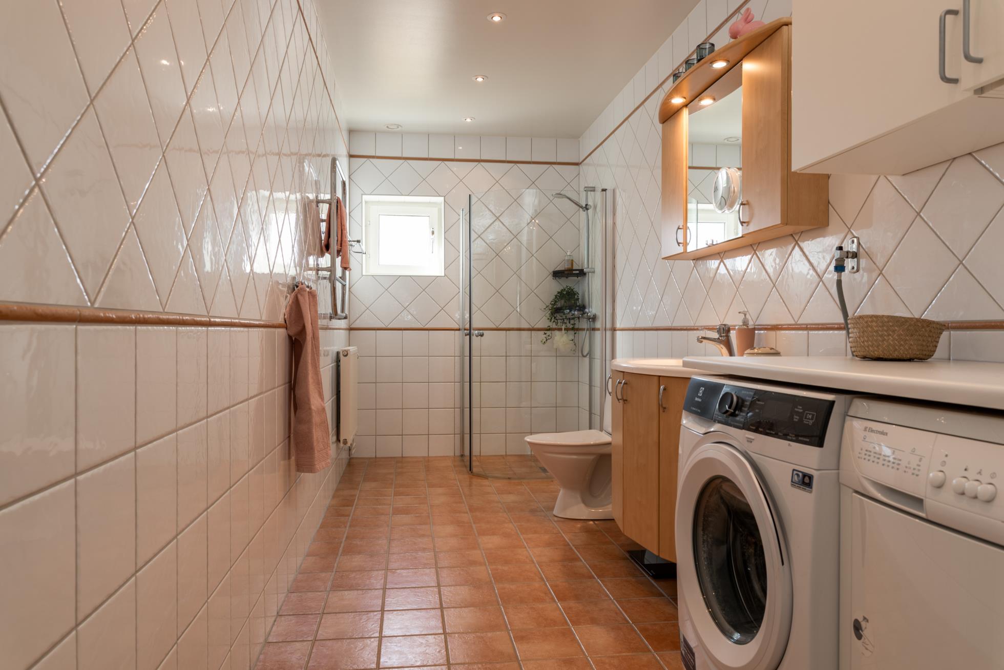 Duschrummet som är väl tilltaget kommer du till höger om hallen. Väggarna är kaklade och golvet har klinker. Här finns det spegel med överskåp och handfat med kommod som erbjuder goda förvaringsmöjligheter. Duschhörna med glasdörrar, handdukstork samt ett välutrustat tvättutrymme med tvättmaskin -25, torktumlare samt överskåp som ger smidig hantering och bra förvaring.
