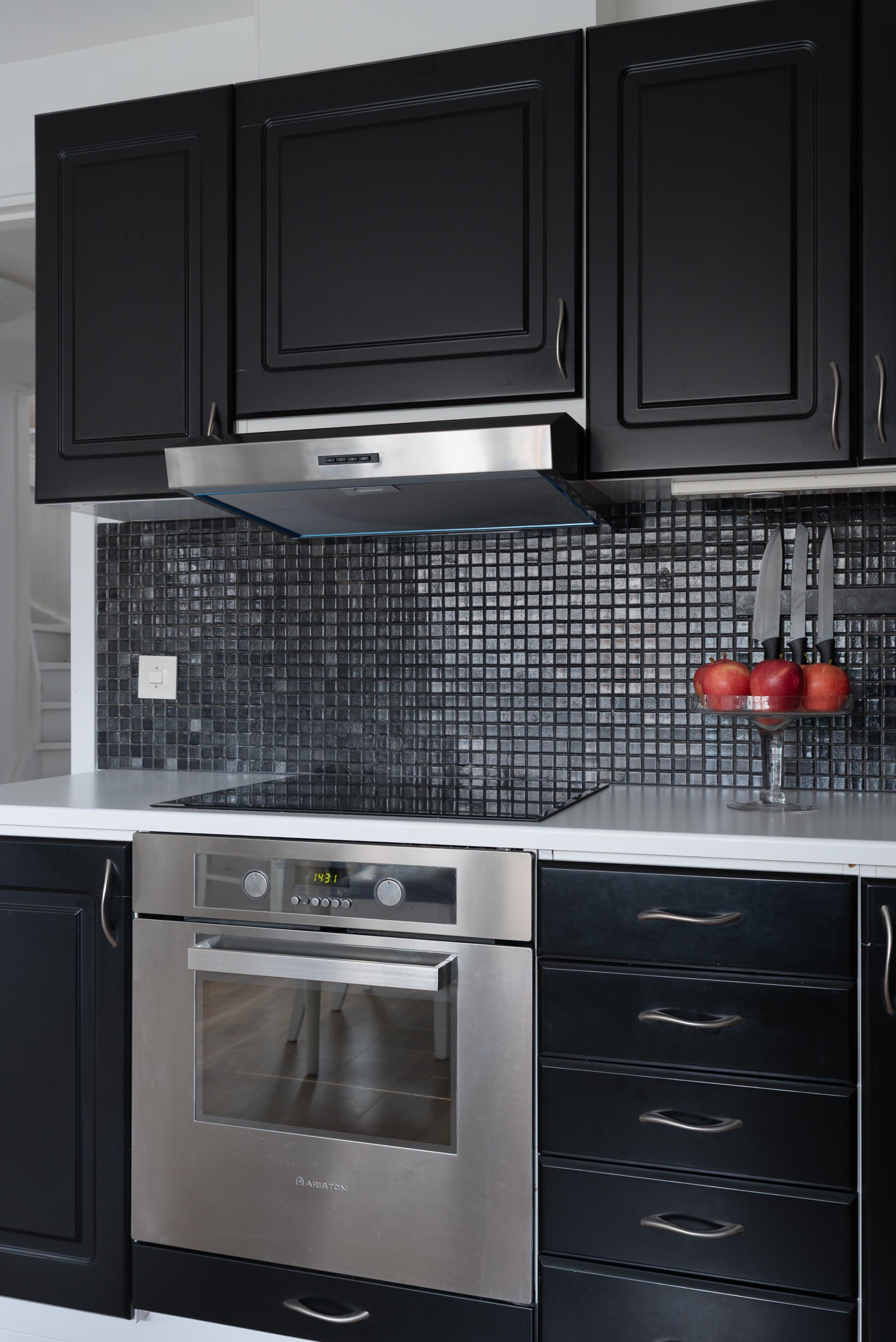 Köket som återfinns till höger om entrén är stilrent och funktionellt med sngga mörka kökssnickerier. Med induktionshällen lagar du maten mycket fort, ny spisfläkten sitter där den skall, ugnen är i snyggt rostfritt och även kyl och frys i rostfritt är nya. Micron har en egen plats i väggen mot tvättstugan. Luckorna går i trendigt svart och blev omlackade under -22. Mellan groventrén och köket finns tvättstugan som har tvättmaskin -19, torktumlare -20, vägghängd värmeväxlare, tvättho och väggskåp.