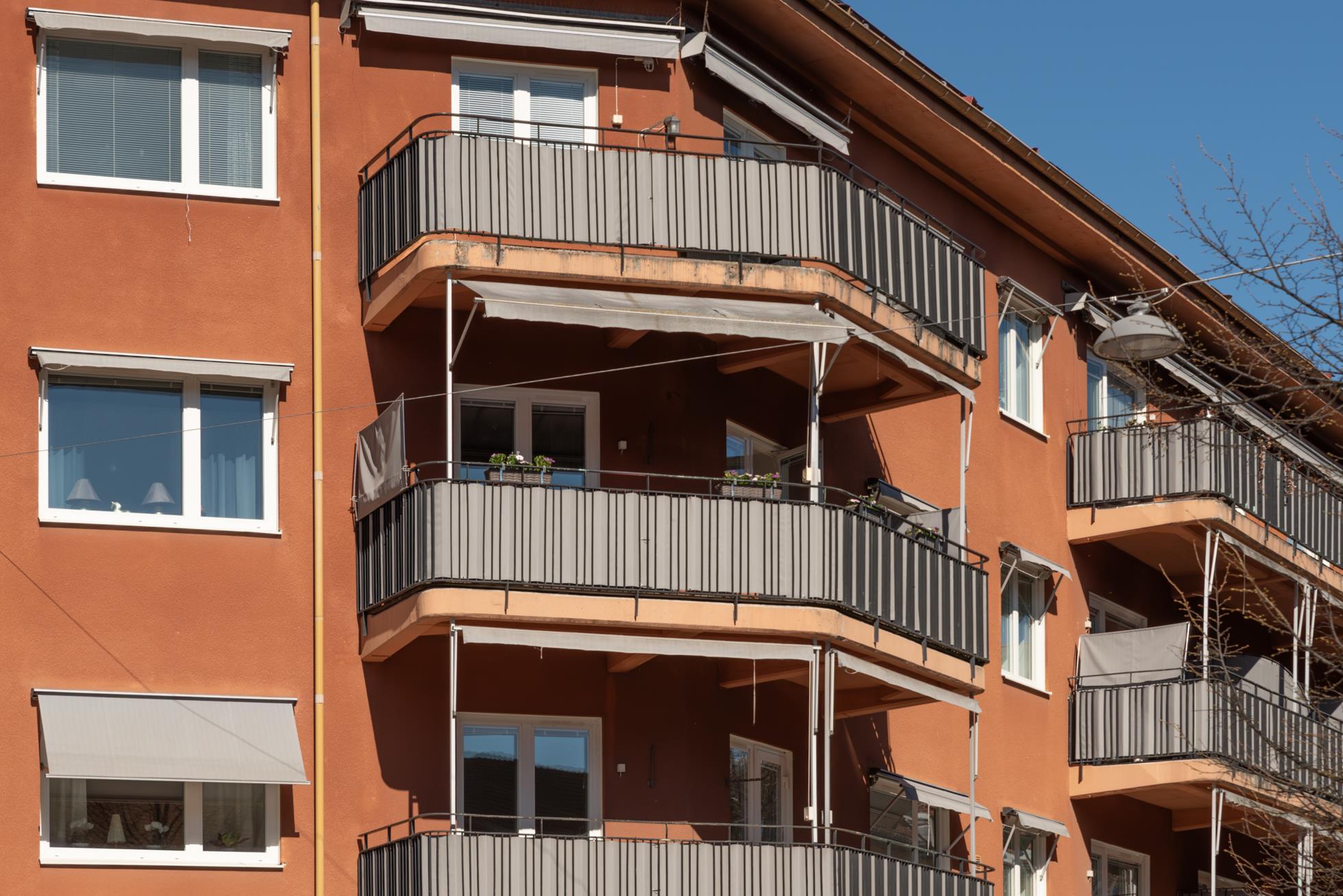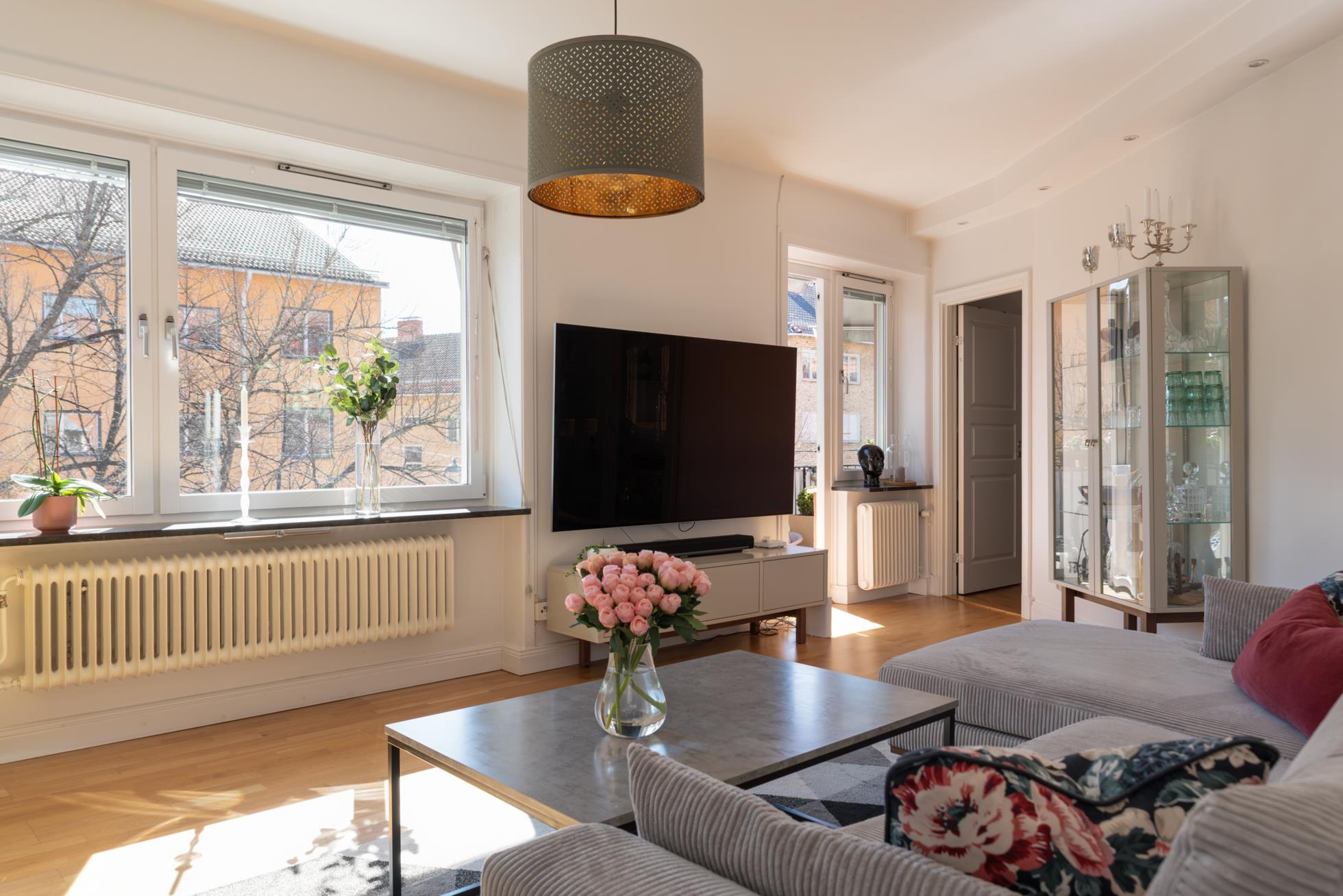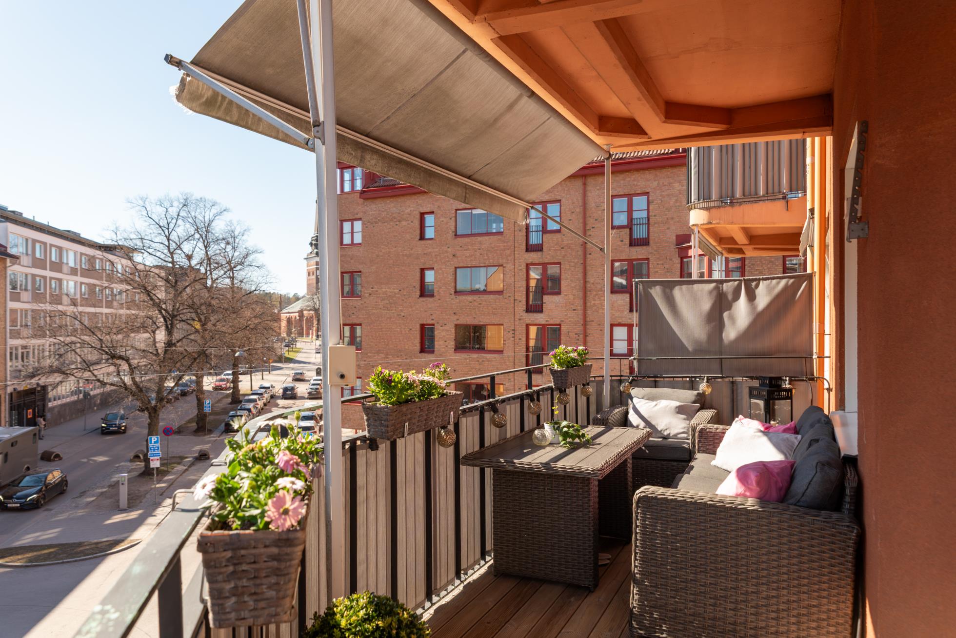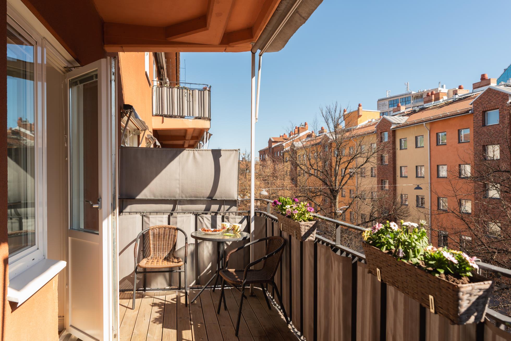 Den stora balkongen är soldränkt från förmiddag till kväll och ger vardagsrummet en extra dimension. Markiser finns om du föredrar svalka.