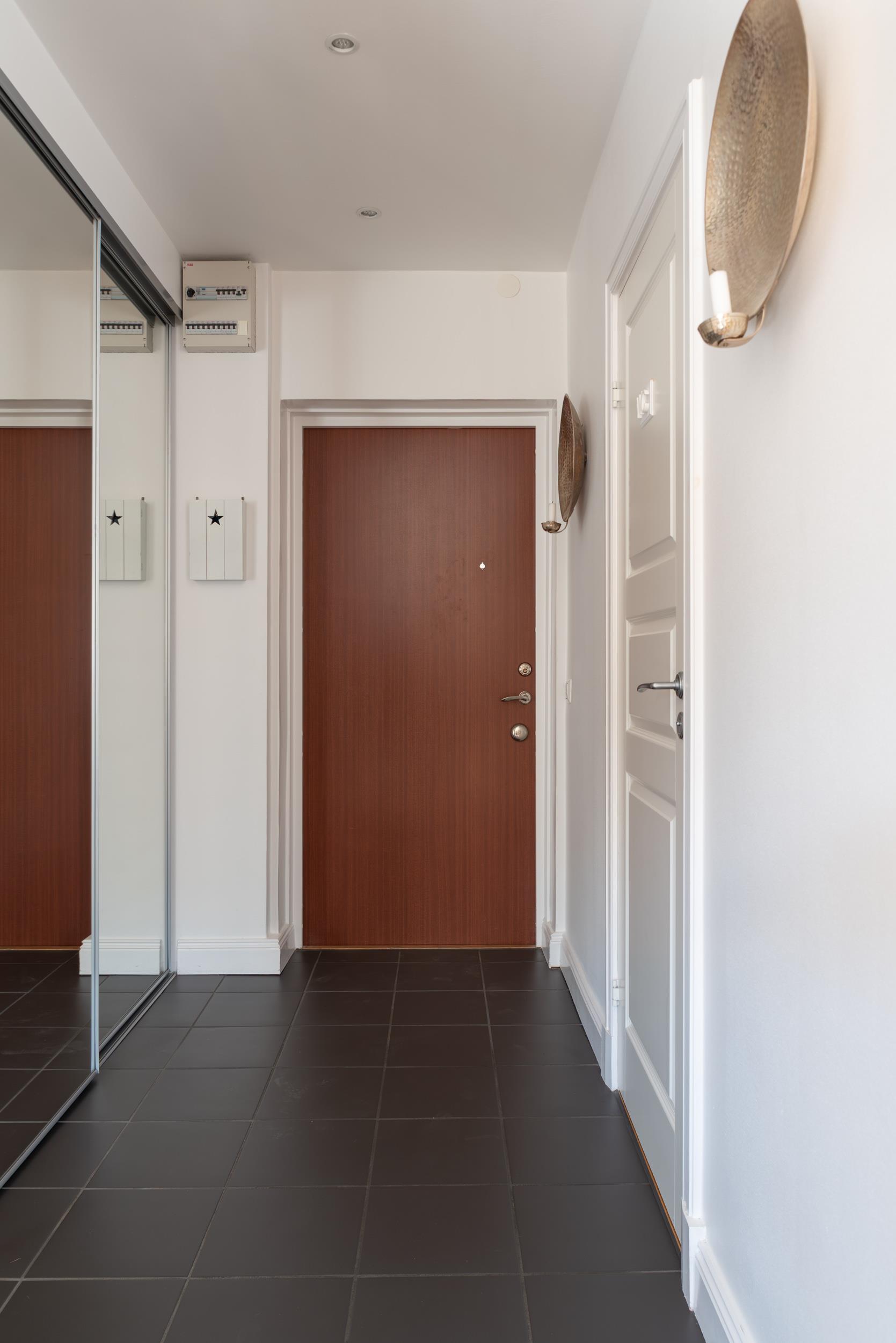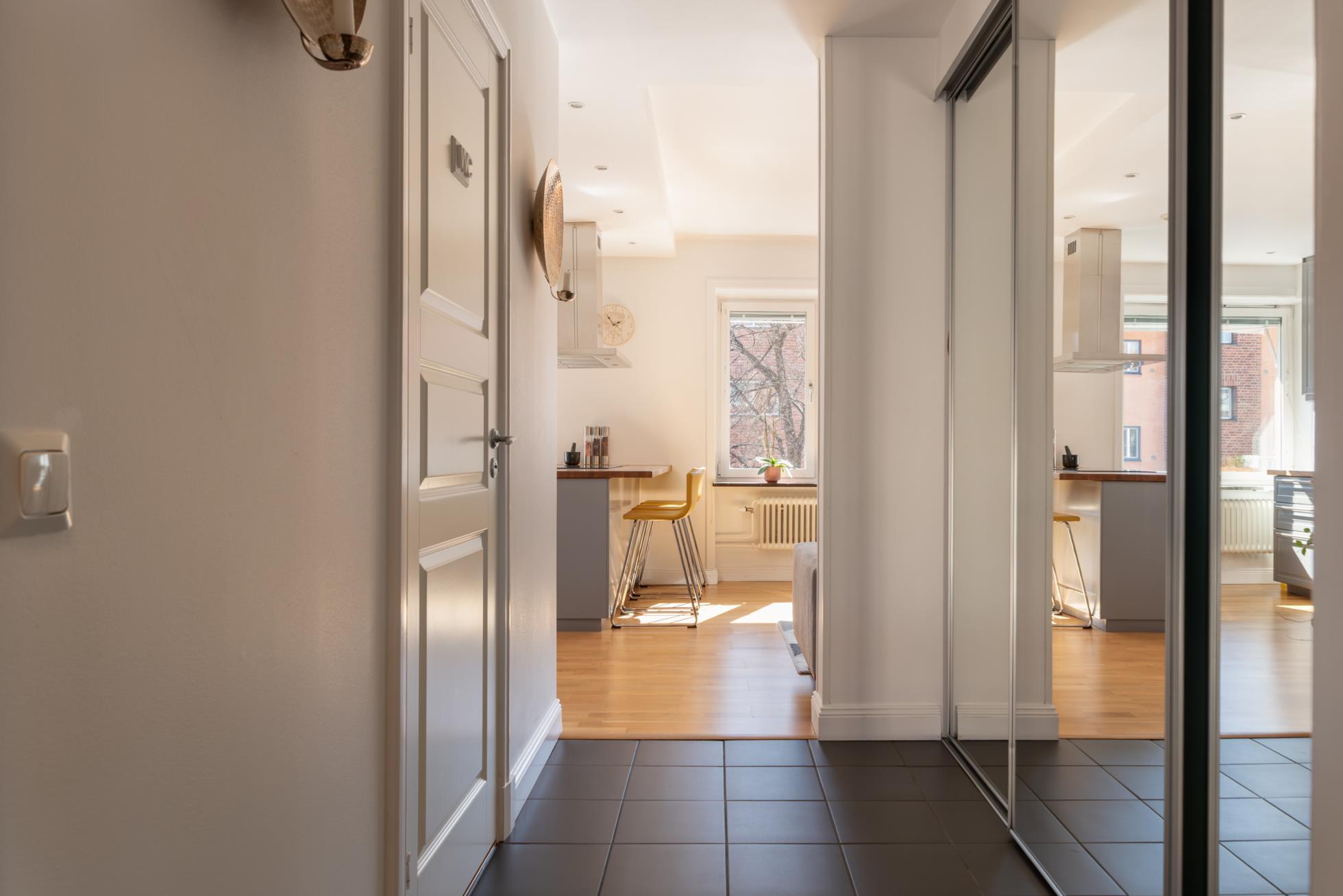 Klinker på golvet i hallen och bra utrymme för klädförvaring bakom skjutdörrar med spegelglas. Även städskrubb döljs här.