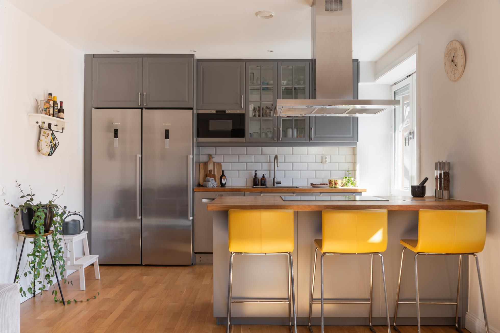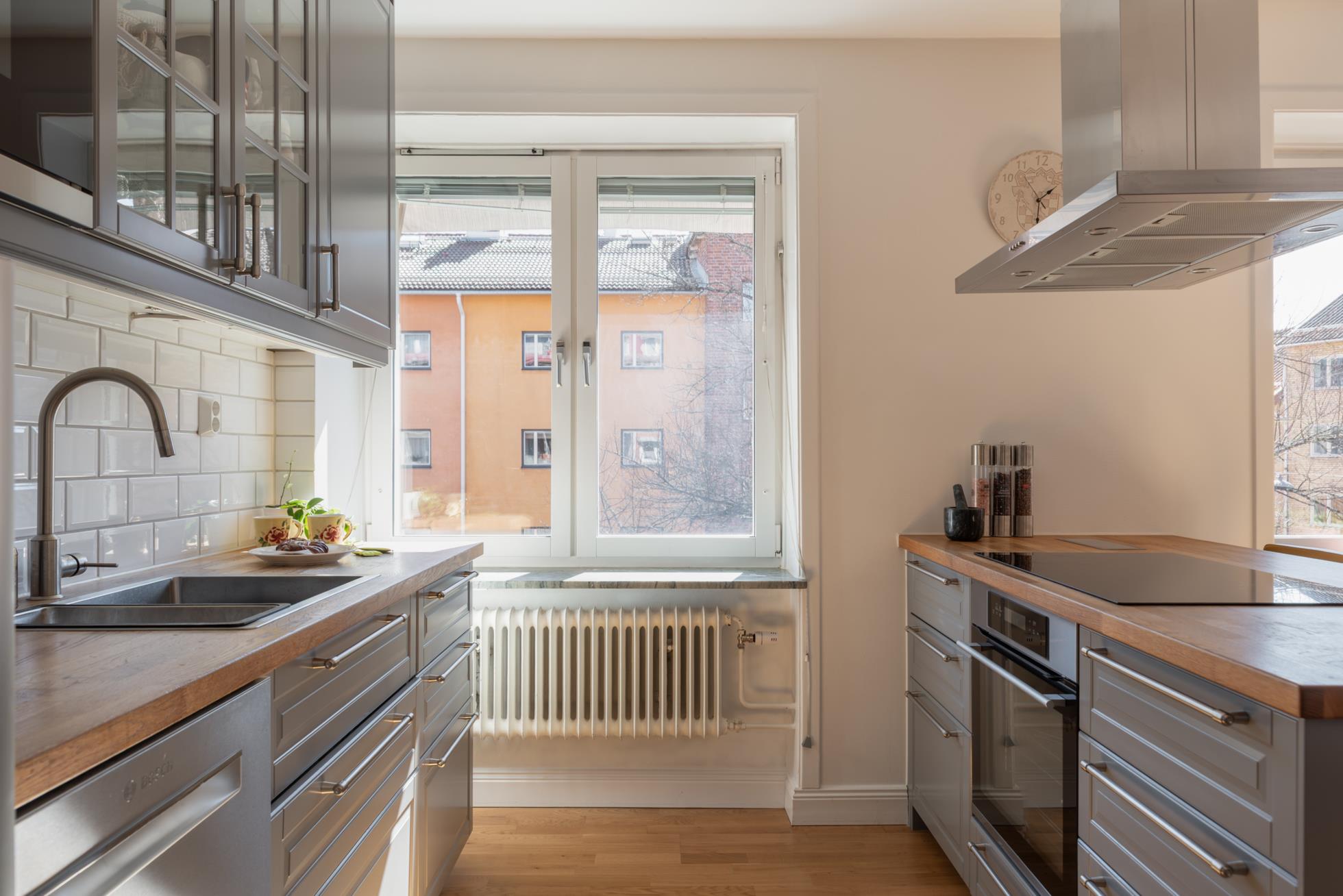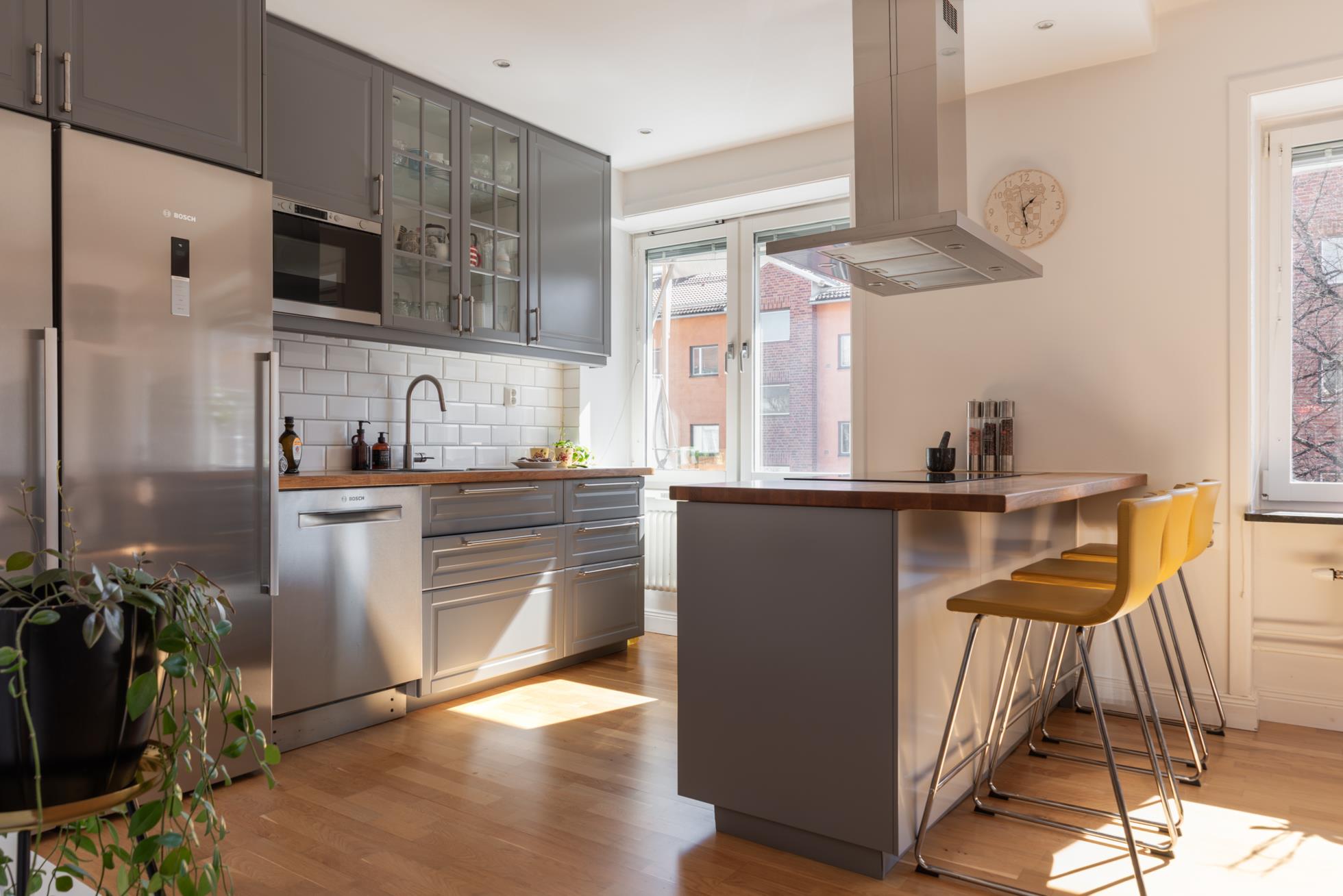 Köksön - en elegant och funktionell avdelare mot vardagsrummet som gör det enkelt att umgås. Köket går i grått med arbetsytor av oljad ek. Maskiner i rostfritt; kyl och frys i fullhöjd, diskmaskin och inbyggd micro. Inbyggd induktionshäll och ugn i köksön, med fläktkåpa ovan. I ön finns också dolda eluttag och förvaring. Ekparkett.
