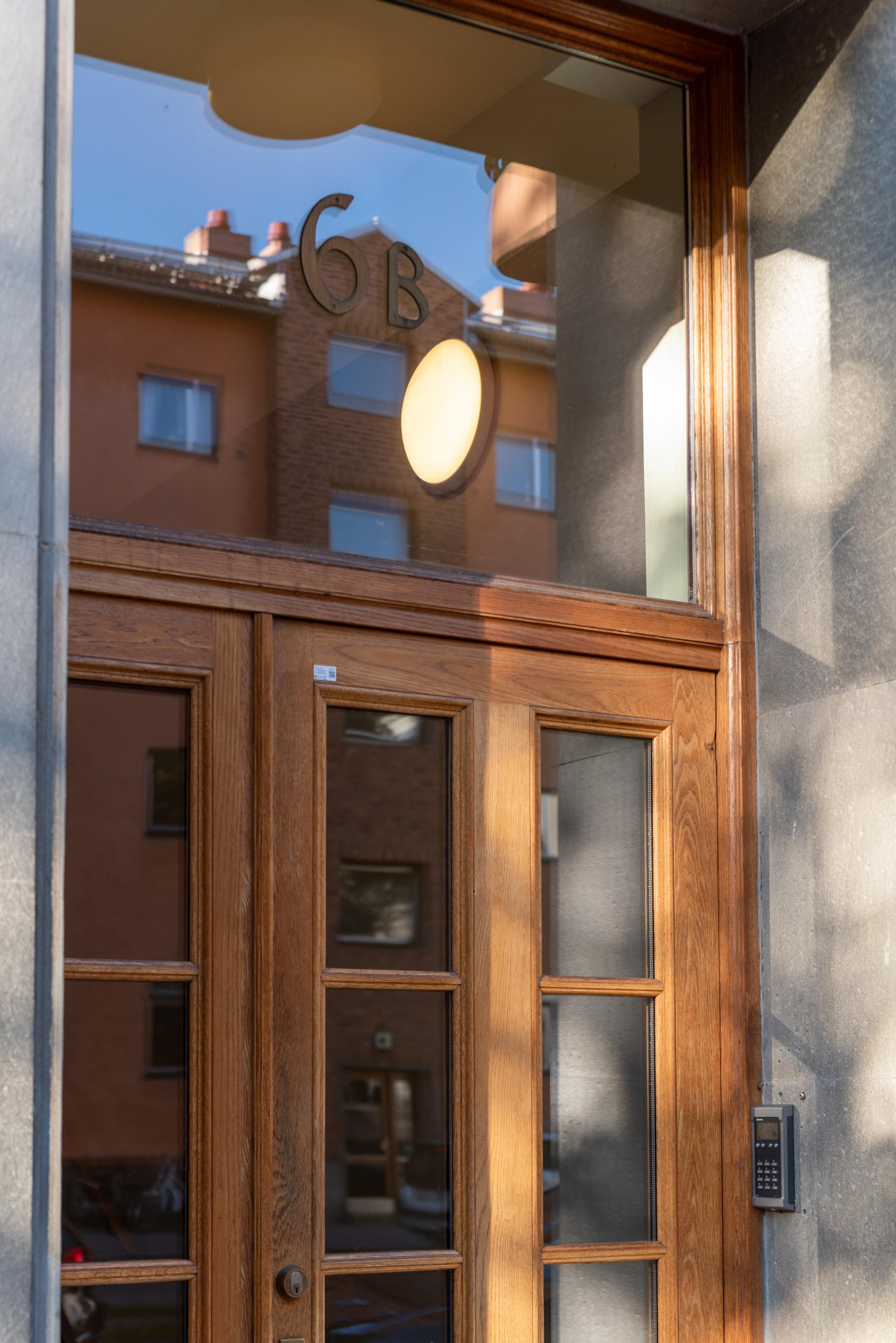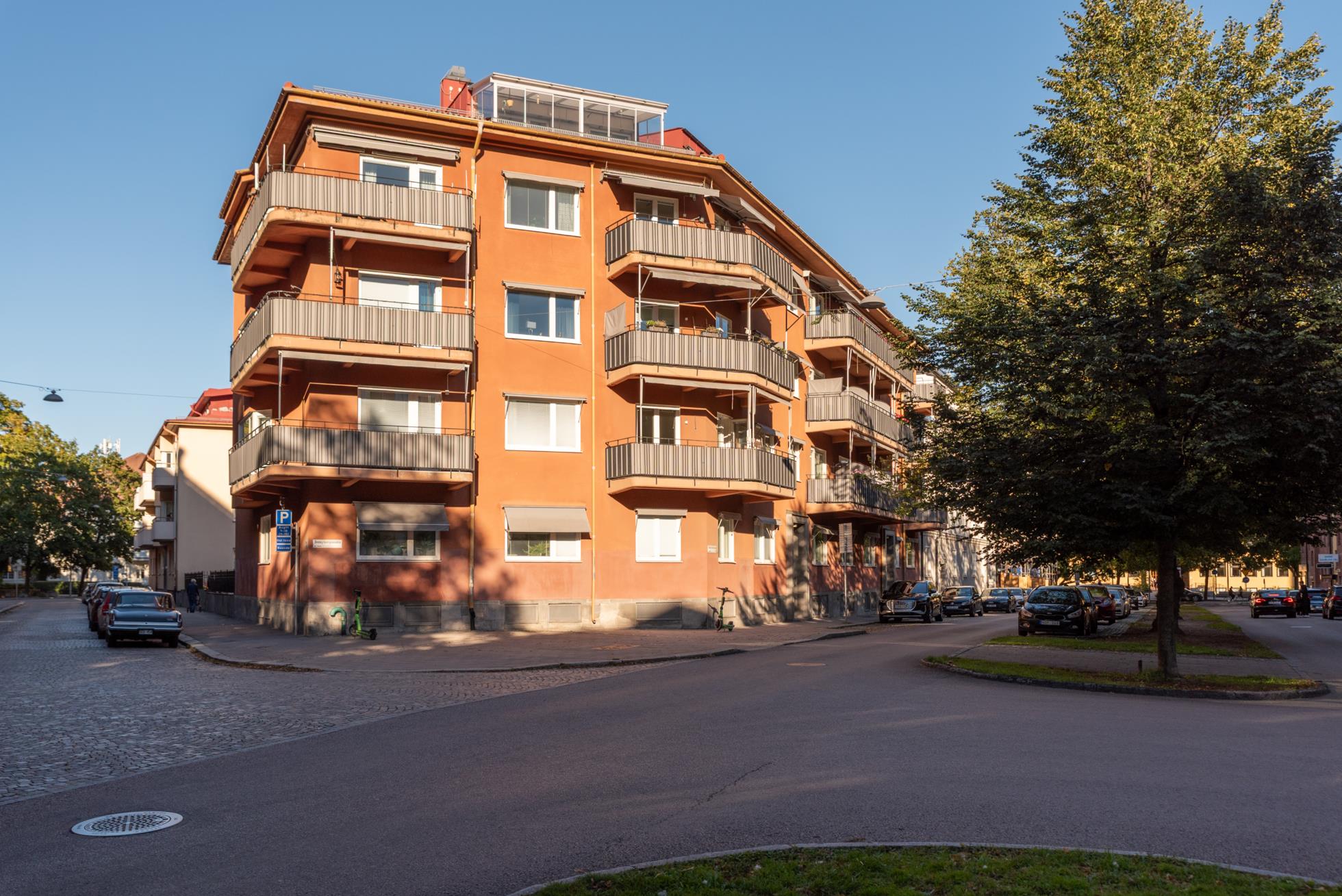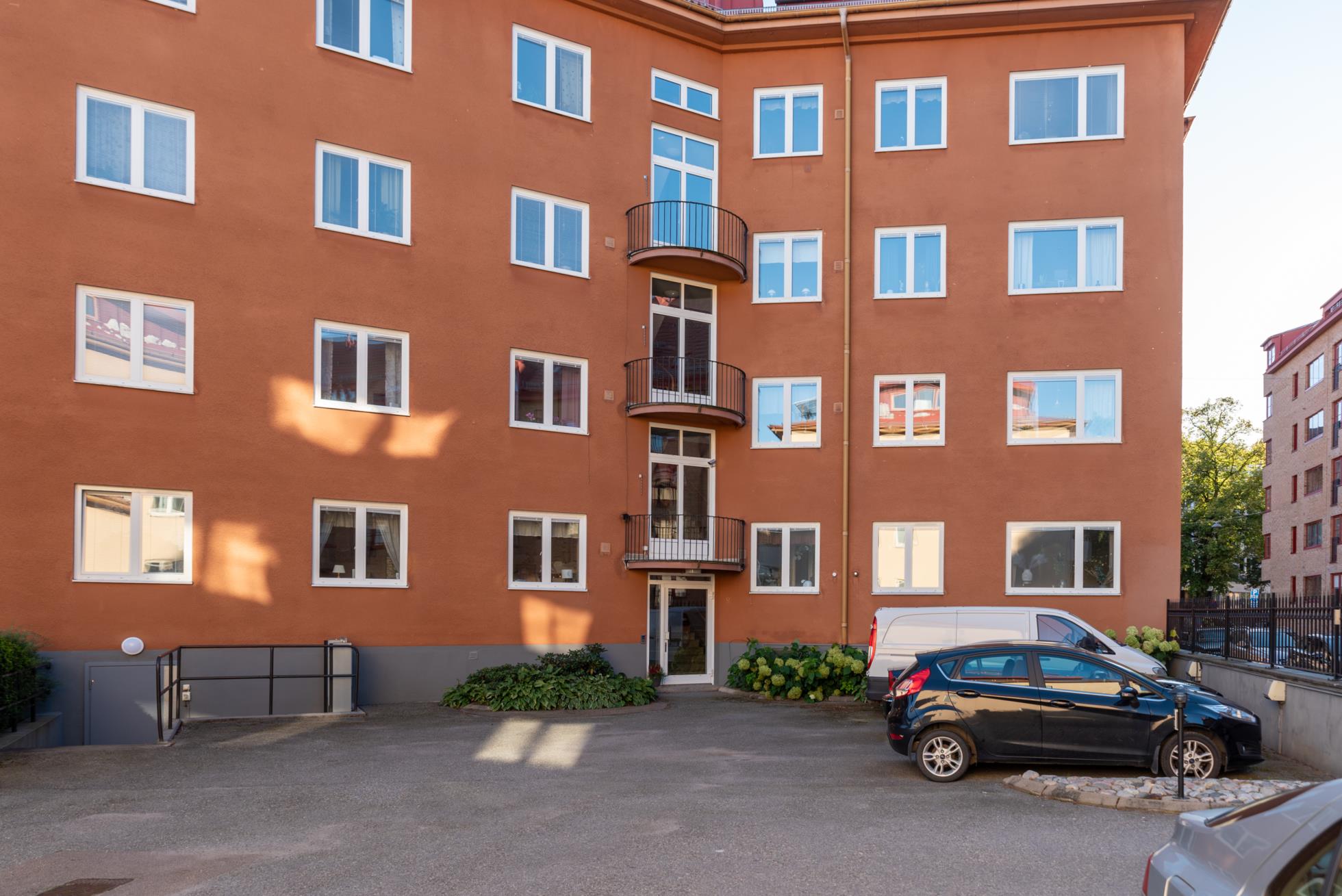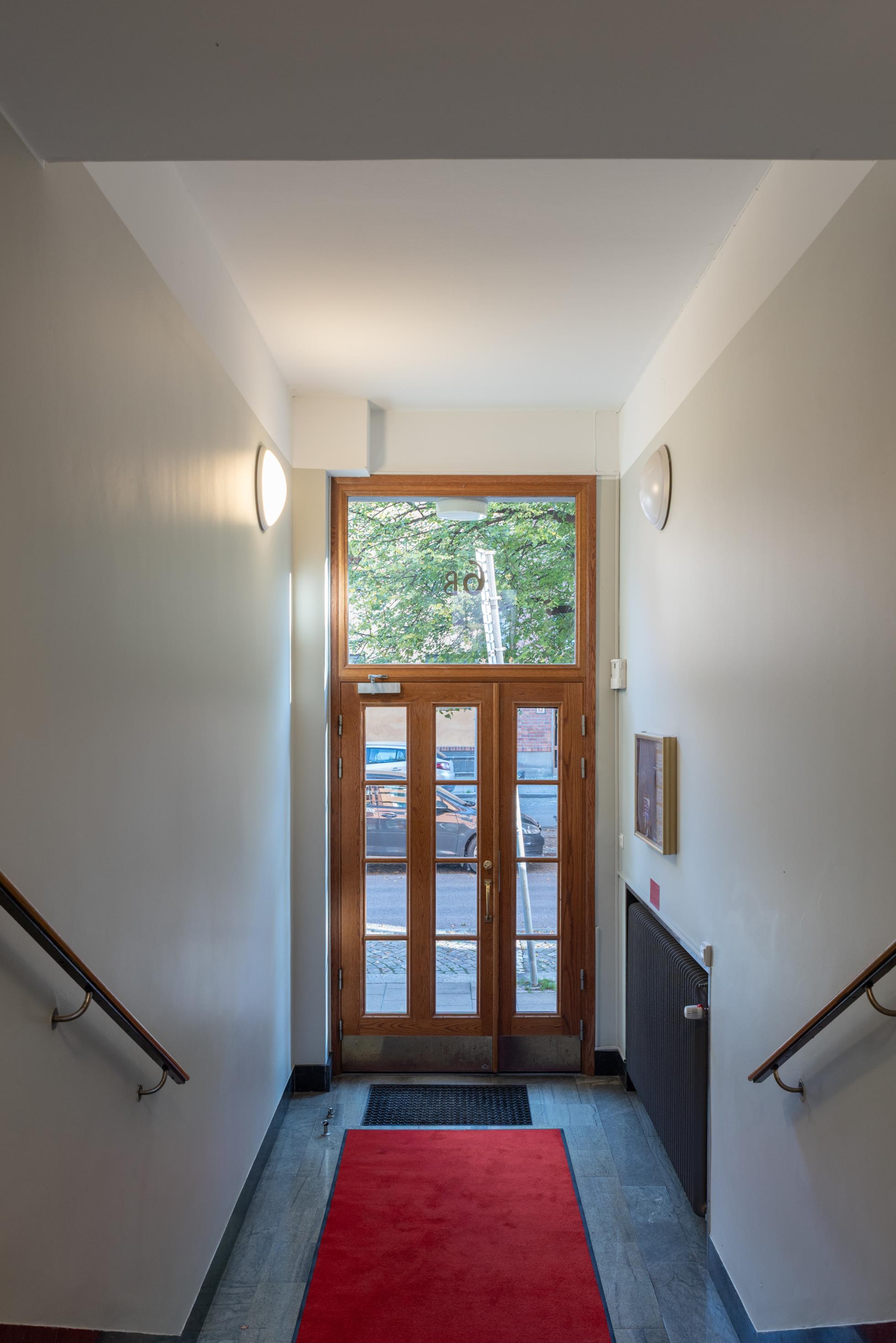 Lägenheten ligger på tredje våningen. En halvtrappa upp från gatan finns hiss.