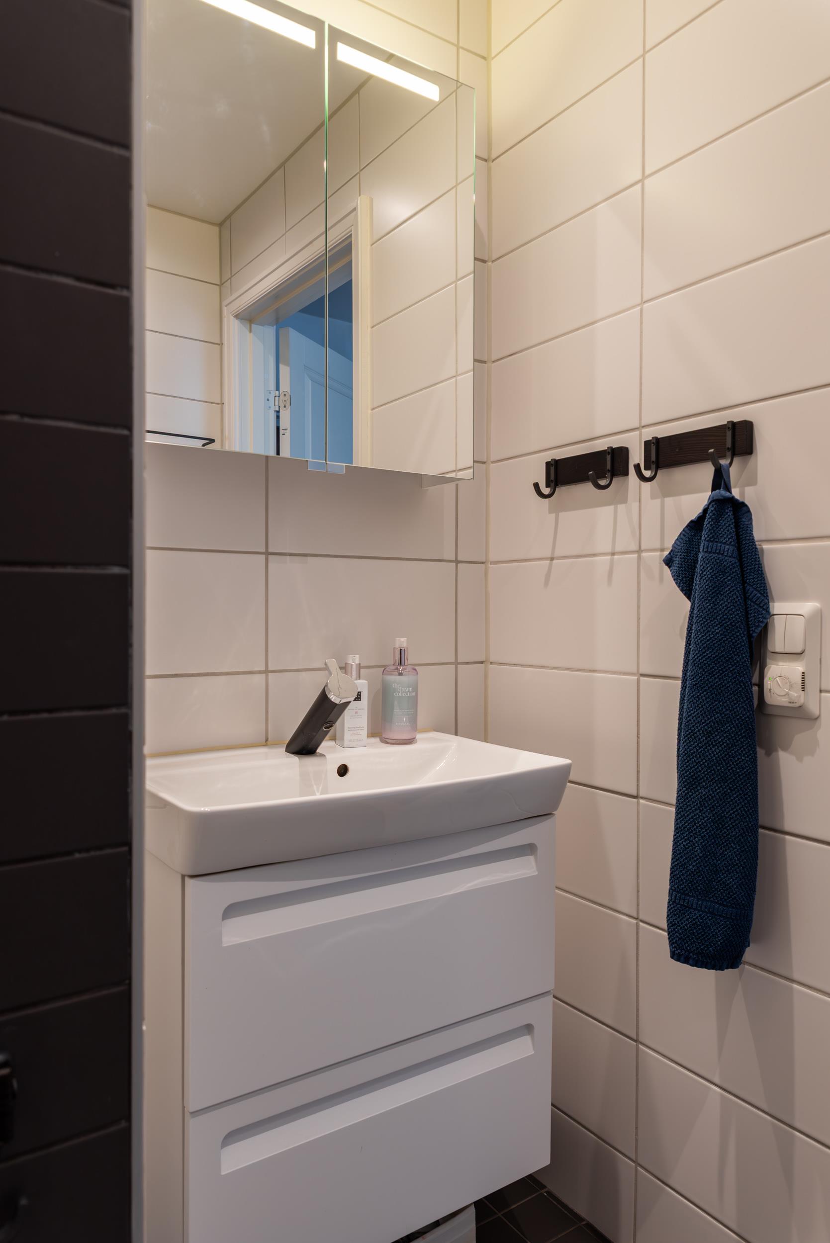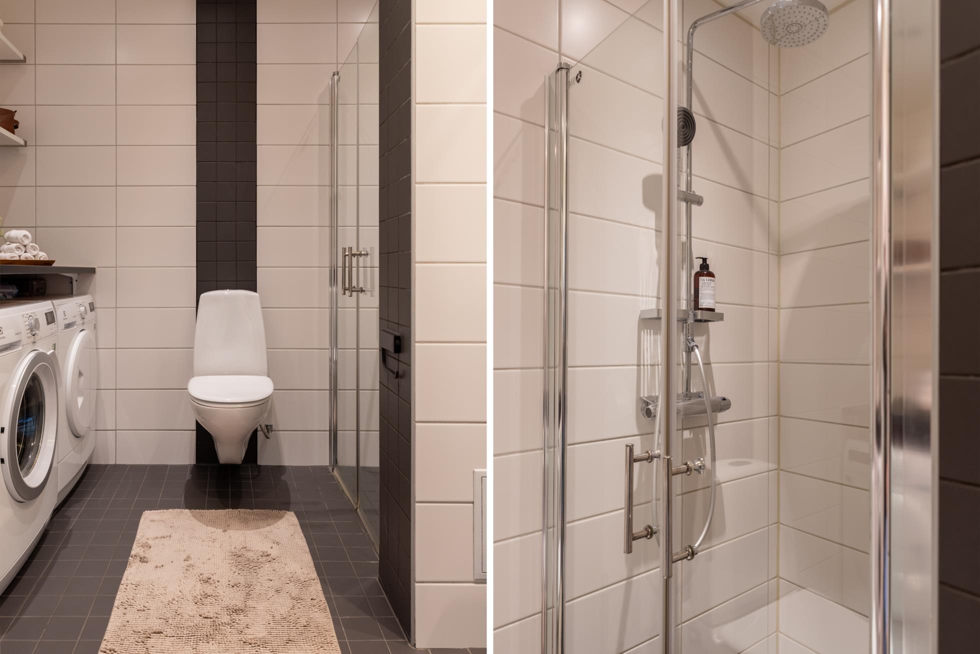 Helkaklat och rymligt badrum med tvättmaskin, torktumlare, arbetsbänk och vägghyllor ovan. Duschen är snyggt inbyggd med glasdörrar, dold bakom en vägg. Vägghängd toalett, tvättställskommod med överskåp. Klinkergolv och golvvärme. Dolda rördragningar.