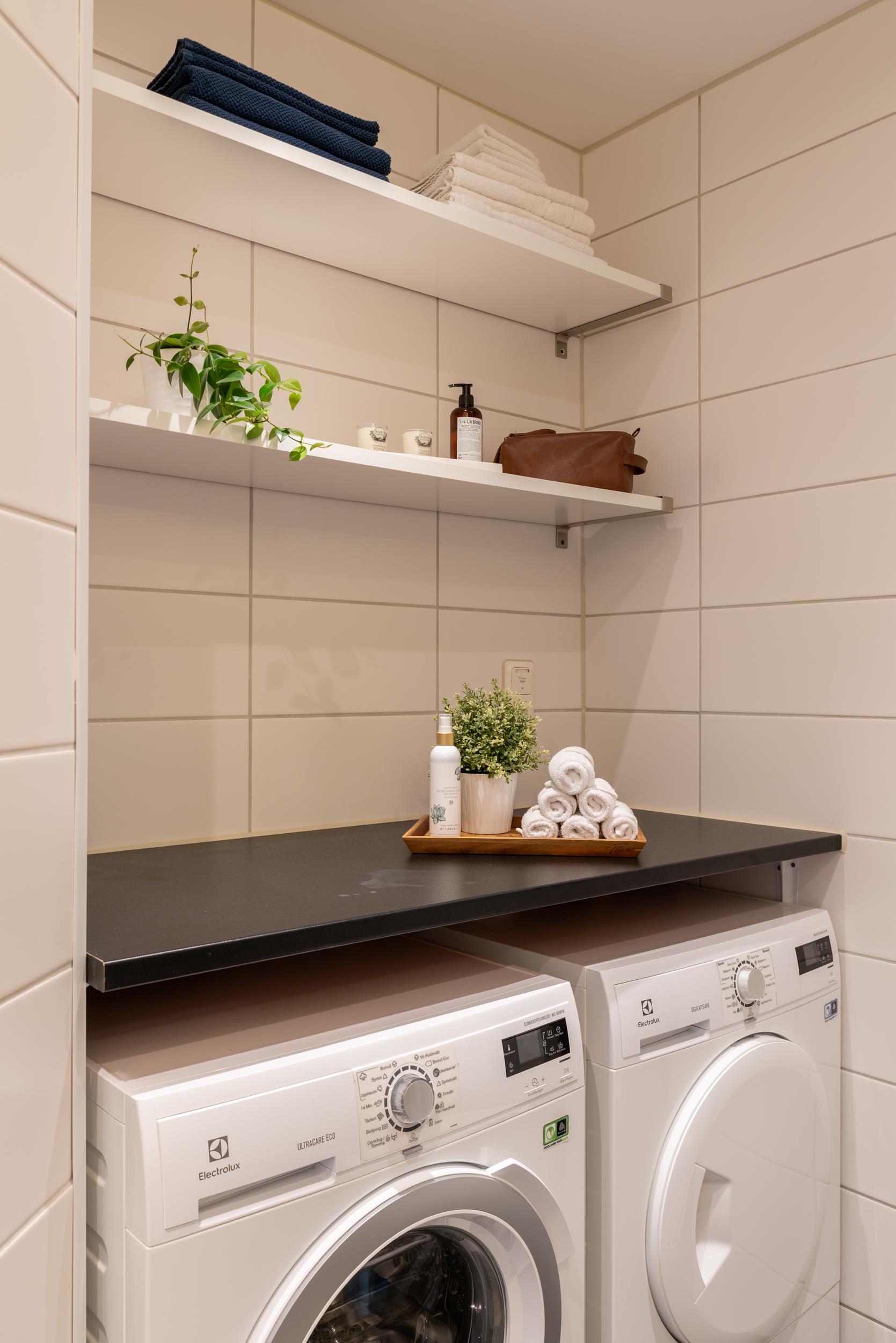 Helkaklat badrum med lyxen av egen tvättmaskin, torktumlare och arbetsbänk.