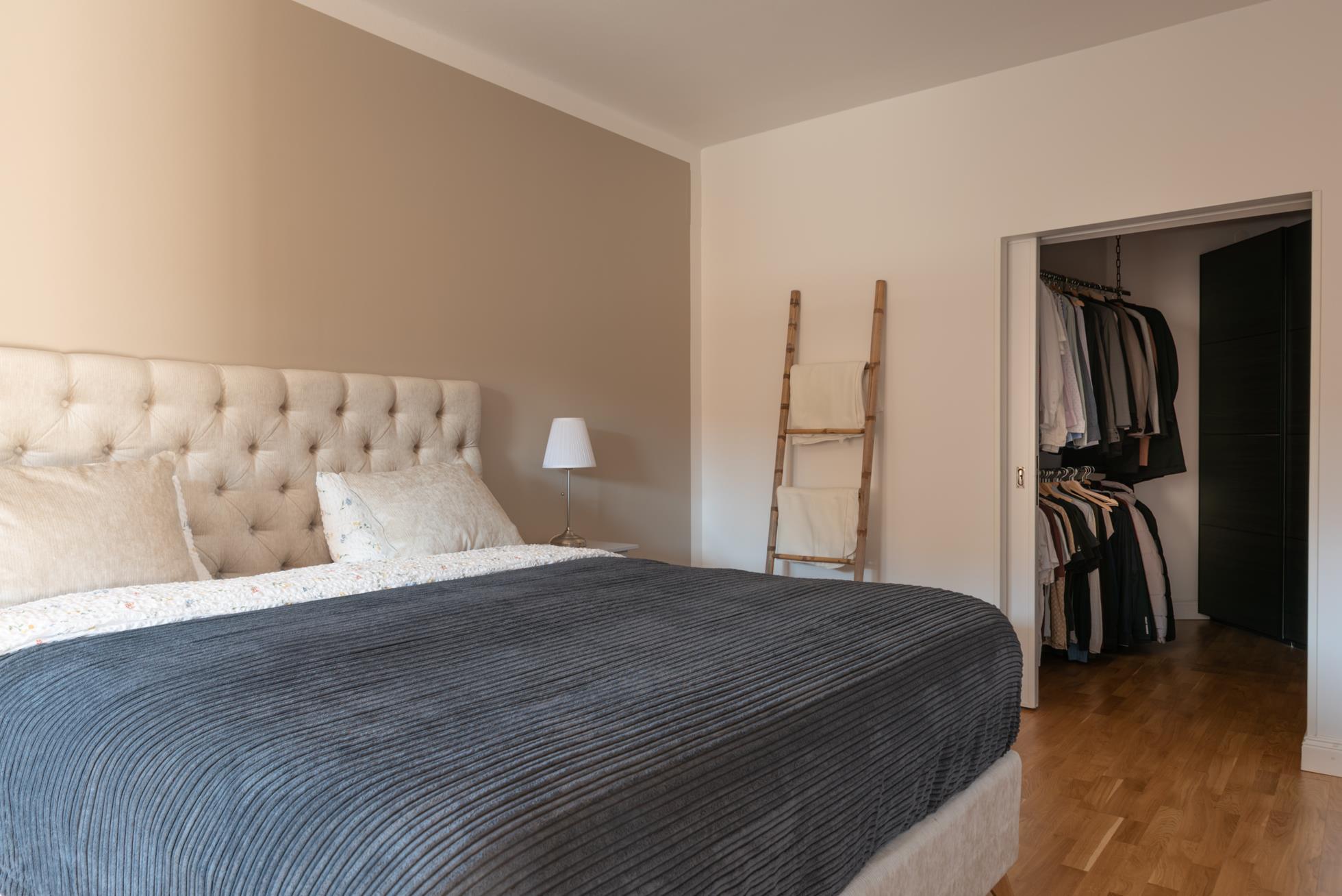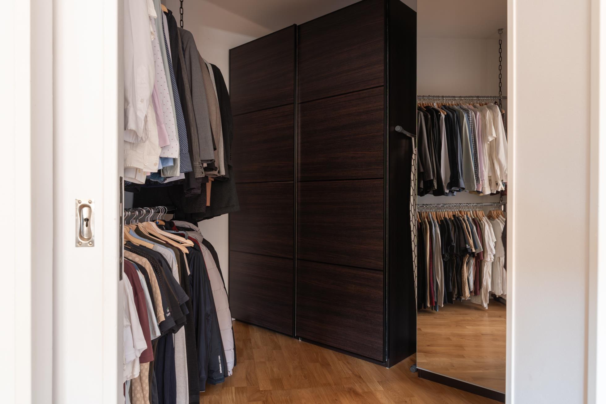 I anslutning till sovrummet, bakom en skjutdörr, finns en inredd walk-in-closet med garderob och klädstänger. Behöver du ett hemmakontor så är det här en bra plats. Parkettgolv även här.
